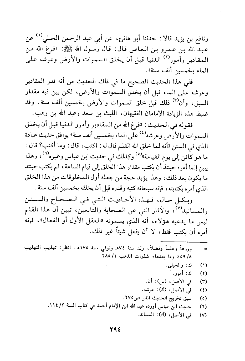 ففي هذا الحديث الصحيح ما في ذلك من أنه قدر المقادير وعرشه على الماء قبل أن يخلق السماوات والأرض لكن بين فيه مقدار السبق وأن ذلك قبل خلق السماوات والأرض بخمسين ألف سنة وقد ضبط هذه الزيادة الإمامان الفقيهان الليث بن سعد وعبد الله بن وهب.