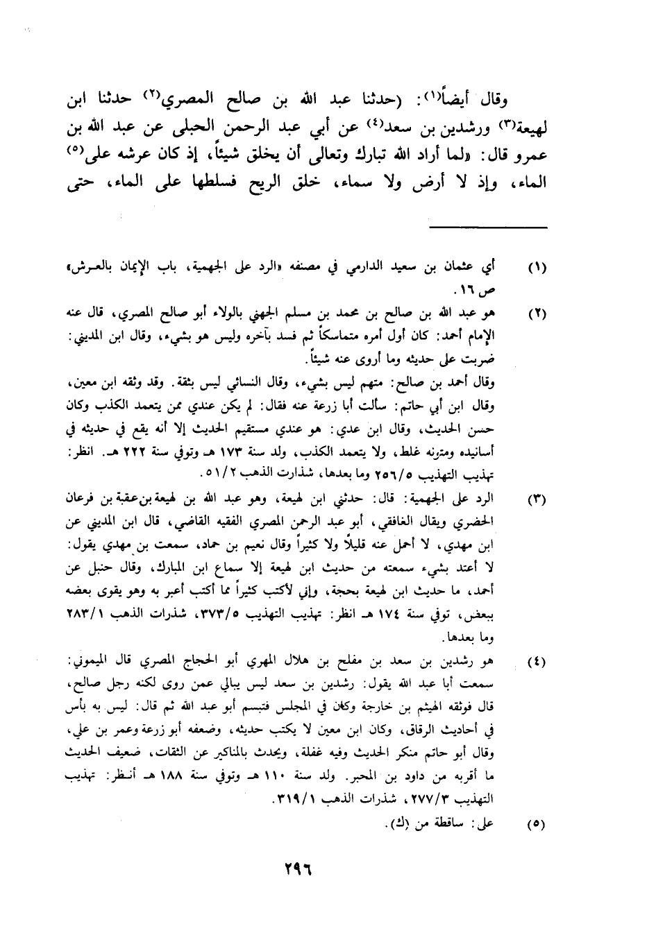 وقال أيضا: حدثنا عبد الله بن صالح المصري حدثنا ابن لهيعة ورشدين بن سعد عن أبي عبد الرحمن الحبلي عن عبد الله بن عمرو قال: "لما أراد الله تبارك وتعالى أن يخلق شيئا إذ كان عرشه على الماء وإذ لا أرض ولا سماء خلق الريح فسلطها على الماء حتى