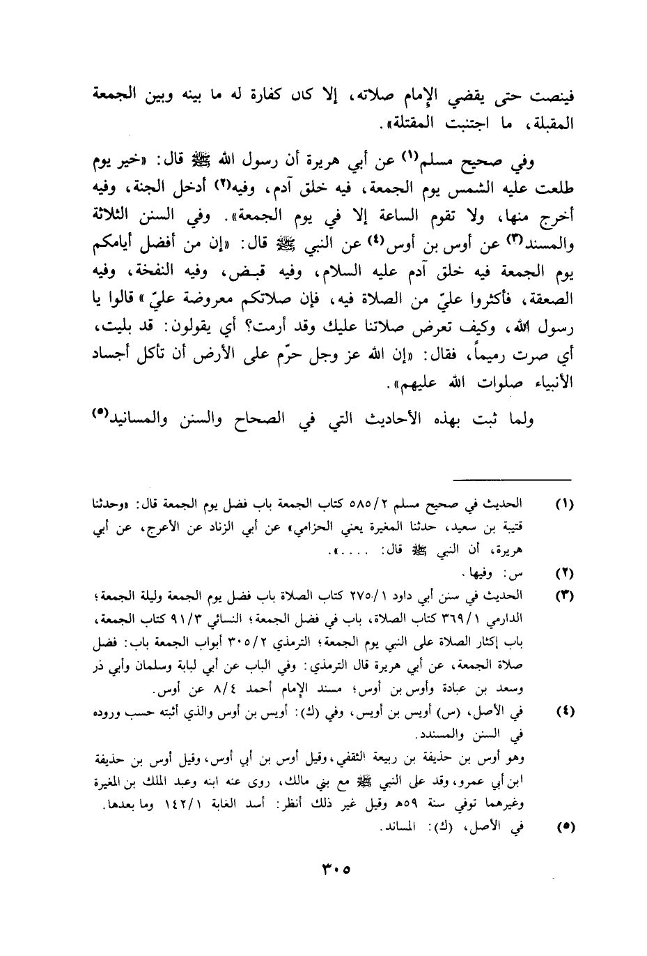 وفي صحيح مسلم عن أبي هريرة أن رسول الله صلى الله عليه وسلم قال: "خير يوم طلعت عليه الشمس يوم الجمعة فيه خلق آدم وفيه أدخل الجنة وفيه أخرج منها ولا تقوم الساعة إلا في يوم الجمعة " وفي السنن الثلاثة والمسند عن أوس بن أوس عن النبي صلى الله عليه وسلم قال: "إن من أفضل أيامكم يوم الجمعة فيه خلق آدم عليه السلام وفيه قبض وفيه النفخة وفيه الصعقة فأكثروا علي من الصلاة فيه فإن صلاتكم معروضة علي قالوا: يا رسول الله وكيف تعرض صلاتنا عليك وقد أرمت؟ أي يقولون قد بليت أي صرت رميما فقال: إن الله عز وجل حرم على الأرض أن تأكل أجساد الأنبياء صلوات الله عليهم".