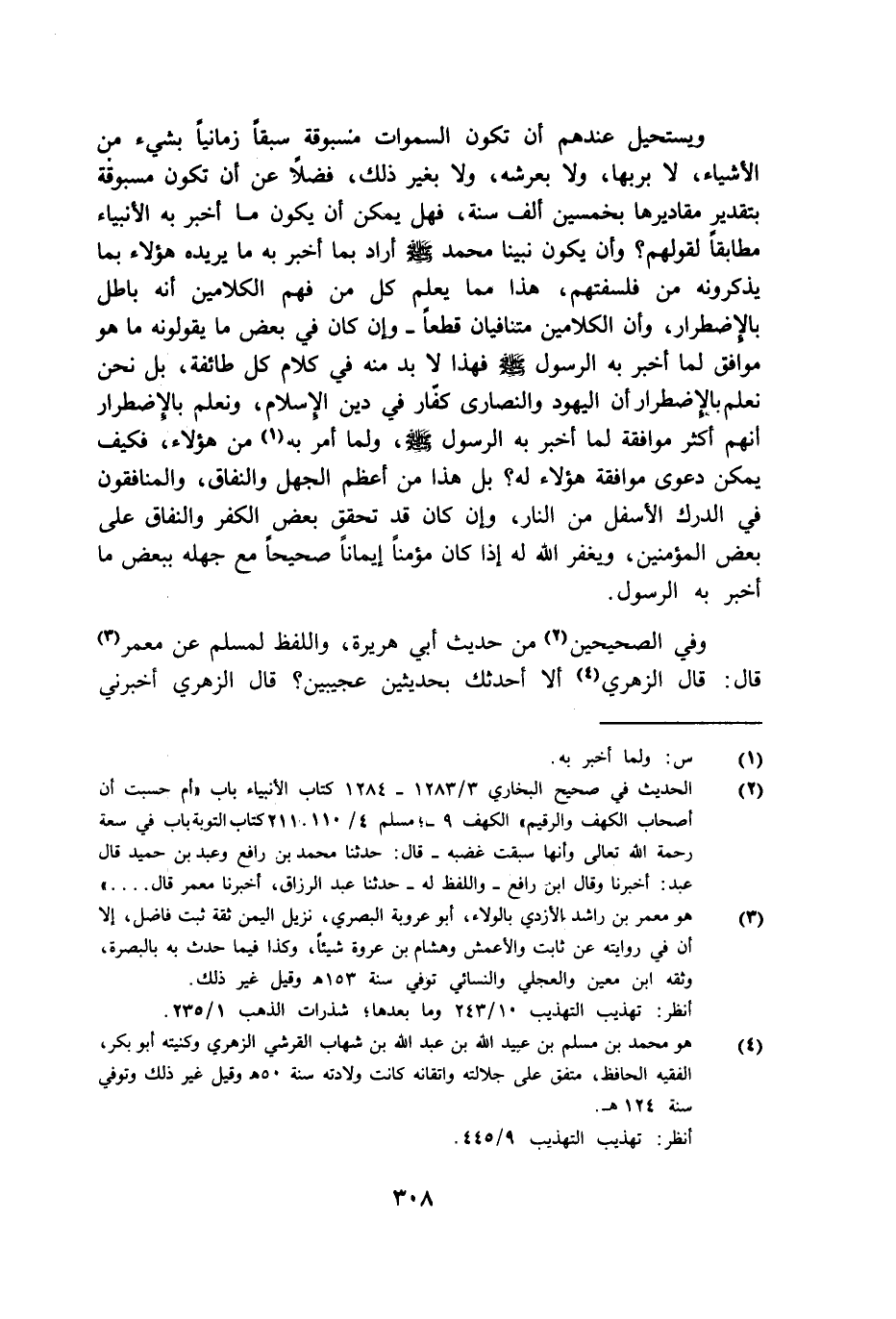 ويستحيل عندهم أن تكون السماوات مسبوقة سبقا زمانيا بشيء من الأشياء لا بربها ولا بعرشه ولا بغير ذلك فضلا عن أن تكون مسبوقة بتقدير مقاديرها بخمسين ألف سنة فهل يمكن أن يكون ما أخبر به الأنبياء مطابقا لقولهم وأن يكون نبينا محمد صلى الله عليه وسلم أراد بما أخبر به ما يريده هؤلاء بما يذكرونه من فلسفتهم هذا مما يعلم كل من فهم الكلامين أنه باطل بالاضطرار وأن الكلامين متنافيان قطعا وإن كان في بعض ما يقولونه ما هو موافق لما أخبر به الرسول فهذا لا بد منه في كلام كل طائفة بل نحن نعلم بالاضطرار أن اليهود والنصارى كفار في دين الإسلام ونعلم بالاضطرار أنهم أكثر موافقة لما أخبر به الرسول صلى الله عليه وسلم ولما أمر به من هؤلاء فكيف يمكن دعوى موافقة هؤلاء له بل هذا من أعظم الجهل والنفاق والمنافقون في الدرك الأسفل من النار وإن كان قد تحقق بعض الكفر والنفاق على بعض المؤمنين ويغفر الله له إذا كان مؤمنا إيمانا صحيحا مع جهله ببعض ما أخبر به الرسول.