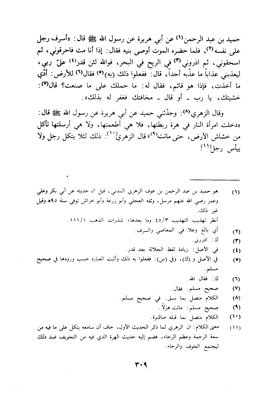 حميد بن عبد الرحمن عن أبي هريرة عن رسول الله صلى الله عليه وسلم قال: "أسرف رجل على نفسه فلما حضره الموت أوصى بنيه فقال إذا أنا مت فاحرقوني ثم اسحقوني ثم اذروني في الريح في البحر فوالله لئن قدر علي ربي ليعذبني عذابا ما عذبه أحدا قال ففعلوا ذلك به فقال للأرض أدي ما أخذت فإذا هو قائم فقال له ما حملك على ما صنعت قال خشيتك يا رب أو قال مخافتك فغفر له بذلك".