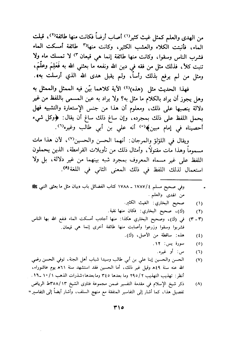 فهذا الحديث مثل هذه الآية كلاهما بين فيه الممثل والممثل به وهل يجوز أن يراد بالكلام ما مثل به ولا يراد به عين المسمى باللفظ من غير دلالة ينصبها على ذلك ومعلوم أن هذا من جنس الاستعارة والتشبيه فهل يحمل اللفظ على ذلك بمجرده وإن ساغ ذلك ساغ أن يقال: {وَكُلَّ شَيْءٍ أَحْصَيْنَاهُ فِي إِمَامٍ مُبِينٍ} أنه علي بن أبي طالب وغيره.