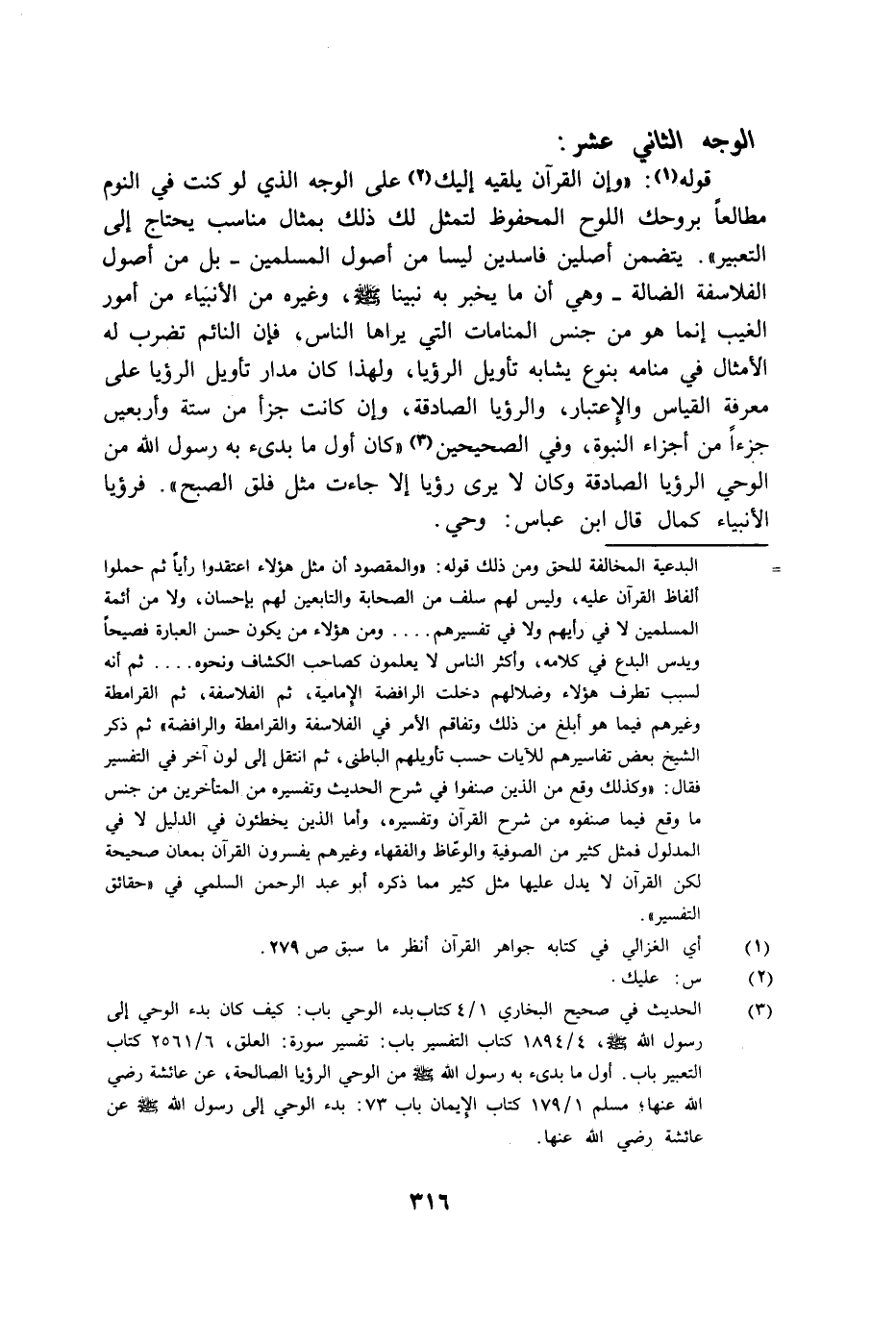 قوله: "وإن القرآن يلقيه إليك على الوجه الذي لو كنت في النوم مطالعا بروحك اللوح المحفوظ لتمثل لك ذلك بمثال مناسب يحتاج إلى التعبير" يتضمن أصلين فاسدين ليسا من أصول المسلمين بل من أصول الفلاسفة الضالة وهي أن ما يخبر به نبينا صلى الله عليه وسلم وغيره من الأنبياء من أمور الغيب إنما هو من جنس المنامات التي يراها الناس فإن النائم تضرب له الأمثال في منامه بنوع يشابه تأويل الرؤيا ولهذا كان مدار تأويل الرؤيا على معرفة القياس والاعتبار والرؤيا الصادقة وإن كانت جزأ من ستة وأربعين جزءا من أجزا النبوة وفي الصحيحين "كان أول ما بدىء به رسول الله من الوحي الرؤيا الصادقة وكان لا يرى رؤيا إلا جاءت مثل فلق الصبح" فرؤيا الأنبياء كمال قال ابن عباس: "وحي".