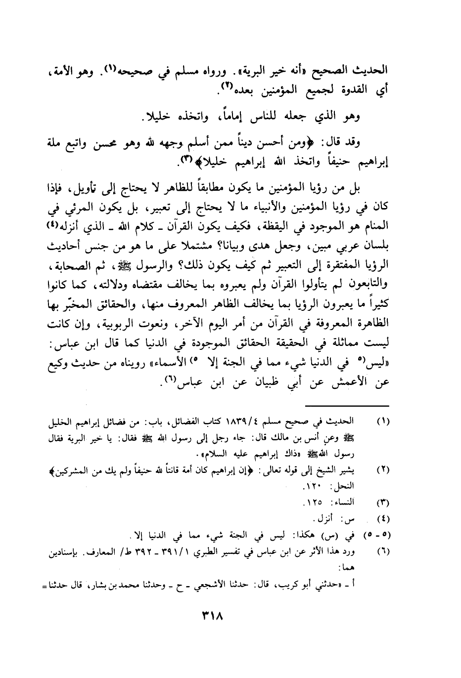 بل من رؤيا المؤمنين ما يكون مطابقا للظاهر لا يحتاج إلى تأويل فإذا كان في رؤيا المؤمنين والأنبياء ما لا يحتاج إلى تعبير بل يكون المرئي في المنام هو الموجود في اليقظة فكيف يكون القرآن كلام الله الذي أنزله بلسان عربي مبين وجعل هدى وبيانا مشتملا على ما هو من جنس أحاديث الرؤيا المفتقرة إلى التعبير ثم كيف يكون ذلك والرسول صلى الله عليه وسلم ثم الصحابة والتابعون لم يتأولوا القرآن ولم يعبروه بما يخالف مقتضاه ودلالته كما كانوا كثيرا ما يعبرون الرؤيا بما يخالف الظاهر المعروف منها والحقائق المخبر بها الظاهرة المعروفة في القرآن من أمر اليوم الآخر ونعوت الربوبية وإن كانت ليست مماثلة في الحقيقة الحقائق الموجودة في الدنيا كما قال ابن عباس: "ليس في الدنيا شيء مما في الجنة إلا الأسماء" رويناه من حديث وكيع عن الأعمش عن أبي ظبيان عن ابن عباس.