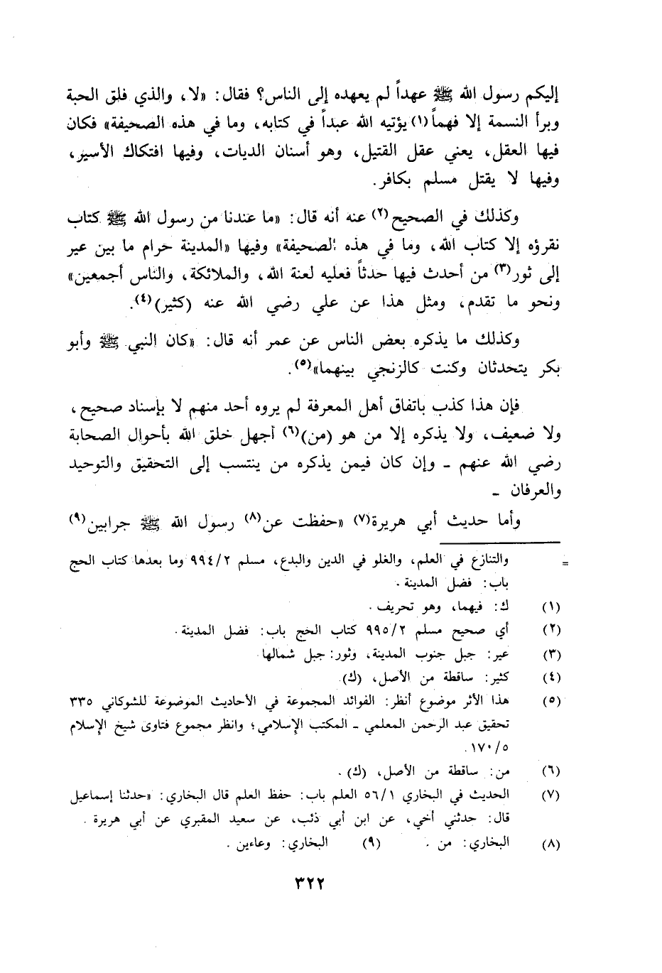 وكذلك في الصحيح عنه أنه قال: "ما عندنا من رسول الله صلى الله عليه وسلم كتاب نقرؤه إلا كتاب الله وما في هذه الصحيفة وفيها "المدينة حرام ما بين عير إلى ثور من أحدث فيها حدثا فعليه لعنة الله والملائكة والناس أجمعين" ونحو ما تقدم ومثل هذا عن علي رضي الله عنه كثير.