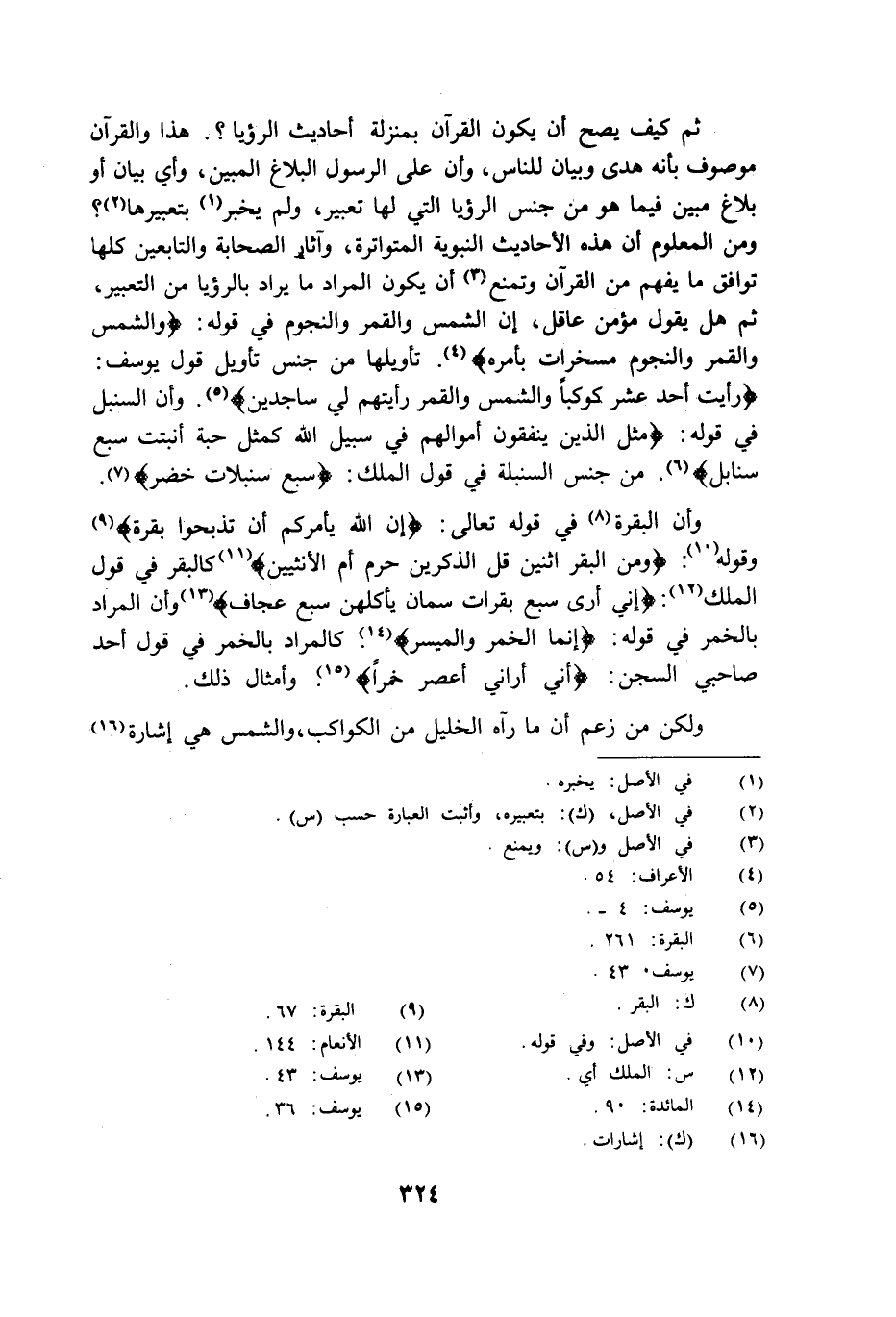 ثم كيف يصح أن يكون القرآن بمنزلة أحاديث الرؤيا؟ هذا والقرآن موصوف بأنه هدى وبيان للناس وأن على الرسول البلاغ المبين وأي بيان أو بلاغ مبين فيما هو من جنس الرؤيا التي لها تعبير ولم يخبر بتعبيرها ومن المعلوم أن هذه الأحاديث النبوية المتواترة وآثار الصحابة والتابعين كلها توافق ما يفهم من القرآن وتمنع أن يكون المراد ما يراد بالرؤيا من التعبير ثم هل يقول مؤمن عاقل إن الشمس والقمر والنجوم في قوله: {وَالشَّمْسَ وَالْقَمَرَ وَالنُّجُومَ مُسَخَّرَاتٍ بِأَمْرِهِ} تأويلها من جنس تأويل قول يوسف: {رَأَيْتُ أَحَدَ عَشَرَ كَوْكَباً وَالشَّمْسَ وَالْقَمَرَ رَأَيْتُهُمْ لِي سَاجِدِينَ} وأن السنبل في قوله: {مَثَلُ الَّذِينَ يُنْفِقُونَ أَمْوَالَهُمْ فِي سَبِيلِ اللَّهِ كَمَثَلِ حَبَّةٍ أَنْبَتَتْ سَبْعَ سَنَابِلَ} من جنس السنبلة في قول الملك: {سَبْعَ سُنْبُلاتٍ خُضْرٍ} .