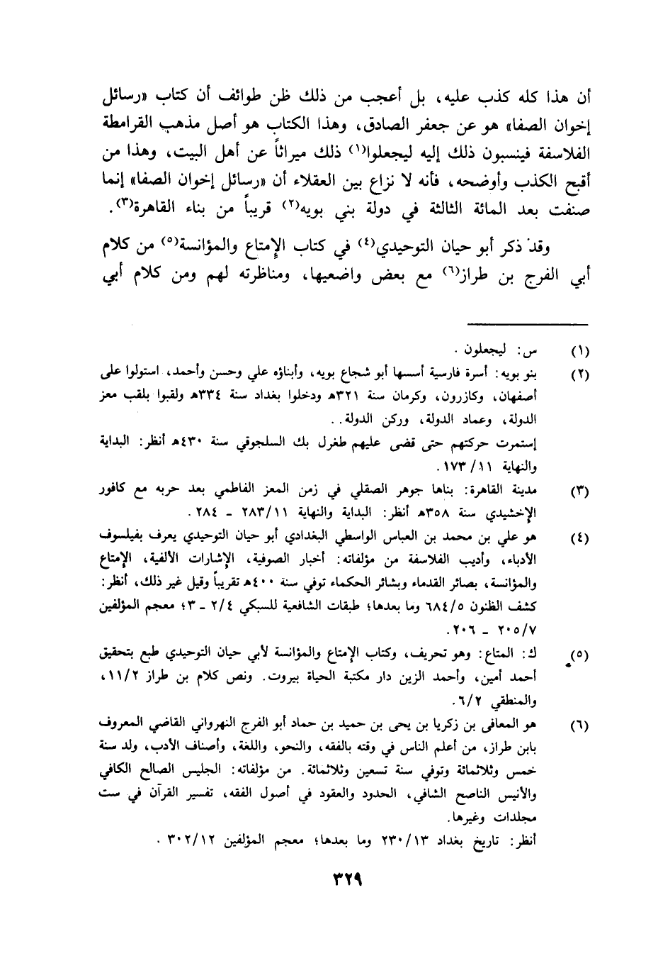 أن هذا كله كذب عليه بل أعجب من ذلك ظن طوائف أن كتاب رسائل إخوان الصفا هو عن جعفر الصادق وهذا الكتاب هو أصل مذهب القرامطة الفلاسفة فينسبون ذلك إليه ليجعلوا ذلك ميراثا عن أهل البيت وهذا من أقبح الكذب وأوضحه فإنه لا نزاع بين العقلاء أن رسائل إخوان الصفا إنما صنفت بعد المائة الثالثة في دولة بني بويه قريبا من بناء القاهرة.