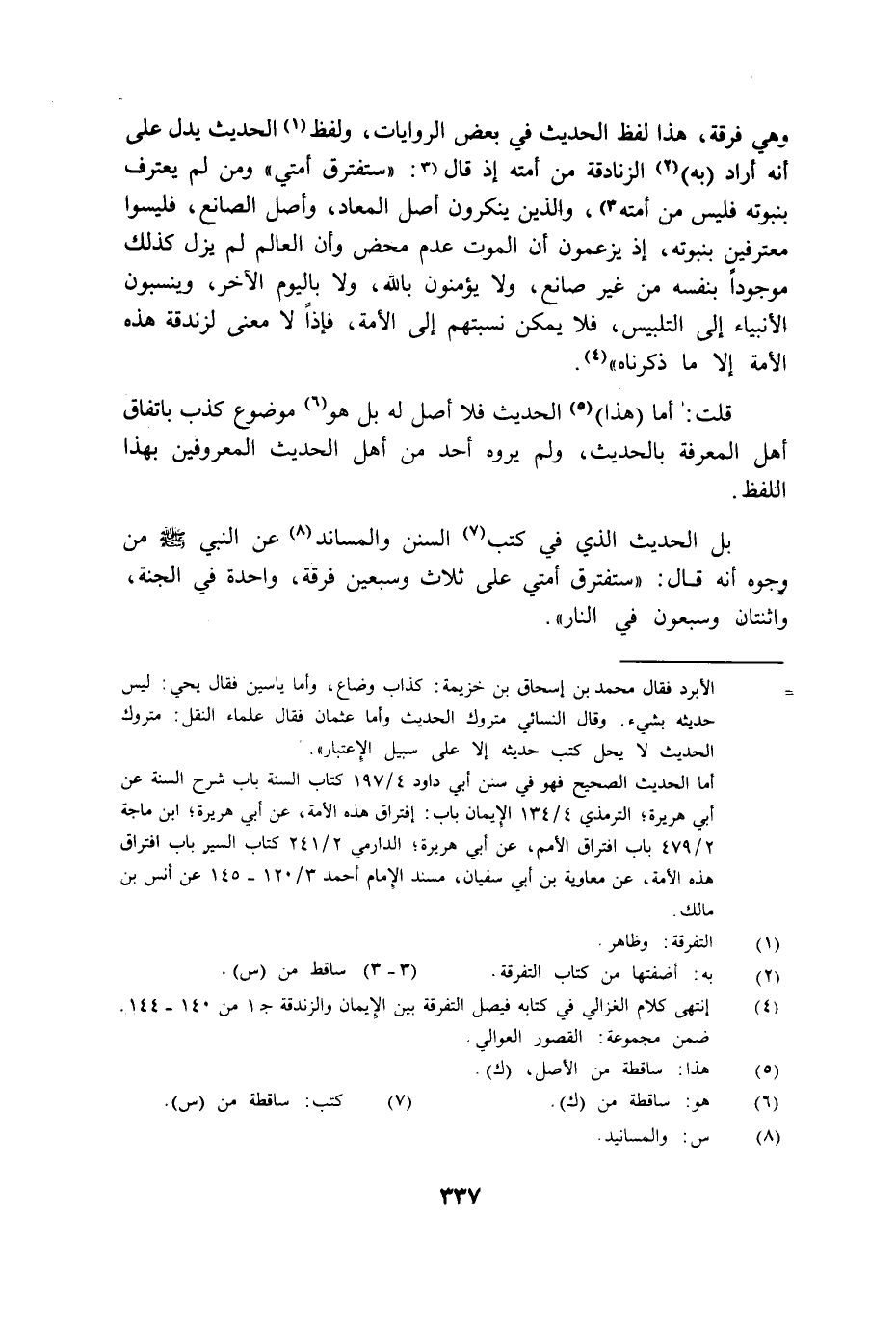 وهي فرقة هذا لفظ الحديث في بعض الروايات ولفظ الحديث يدل على أنه أراد به الزنادقة من أمته إذ قال: "ستفترق أمتي" ومن لم يعترف بنبوته فليس من أمته والذين ينكرون أصل المعاد وأصل الصانع فليسوا معترفين بنبوته إذ يزعمون أن الموت عدم محض وأن العالم لم يزل كذلك موجودا بنفسه من غير صانع ولا يؤمنون بالله ولا باليوم الآخر وينسبون الأنبياء إلى التلبيس فلا يمكن نسبتهم إلى الأمة فإذا لا معنى لزندقة هذه الأمة إلا ما ذكرناه".