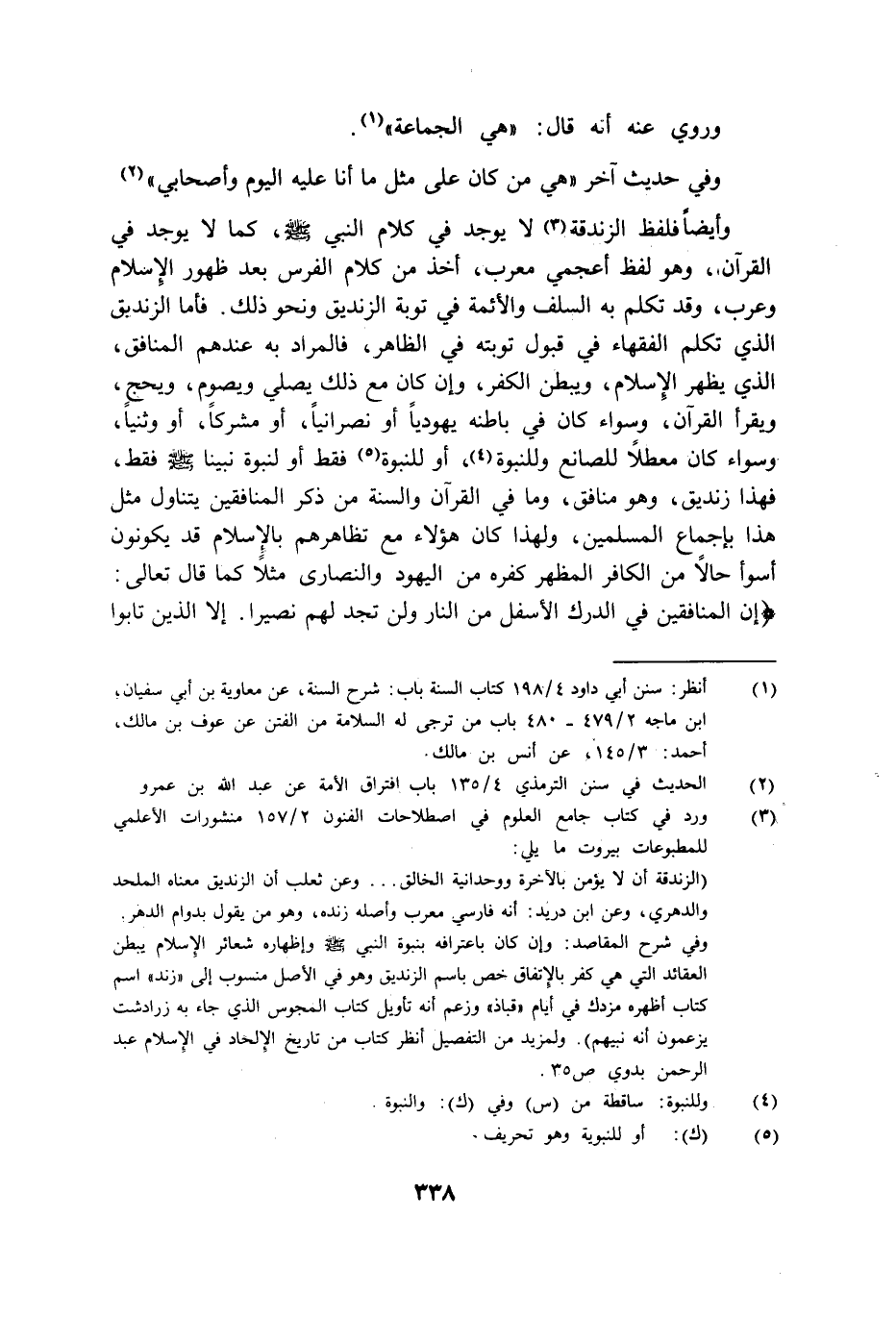 وأيضا فلفظ الزندقة لا يوجد في كلام النبي صلى الله عليه وسلم كما لا يوجد في القرآن وهو لفظ أعجمي معرب أخذ من كلام الفرس بعد ظهور الإسلام وعرب وقد تكلم به السلف والأئمة في توبة الزنديق ونحو ذلك فأما الزنديق الذي تكلم الفقهاء في قبول توبته في الظاهر فالمراد به عندهم المنافق الذي يظهر الإسلام ويبطن الكفر وإن كان مع ذلك يصلي ويصوم ويحج ويقرأ القرآن وسواء كان في باطنه يهوديا أو نصرانيا أو مشركا أو وثنيا وسواء كان معطلا للصانع وللنبوة أو للنبوة فقط أو لنبوة نبينا صلى الله عليه وسلم فقط فهذا زنديق وهو منافق وما في القرآن والسنة من ذكر المنافقين يتناول مثل هذا بإجماع المسلمين ولهذا كان هؤلاء مع تظاهرهم بالإسلام قد يكونون أسوأ حالا من الكافر المظهر كفره من اليهود والنصارى مثلا كما قال تعالى: {إِنَّ الْمُنَافِقِينَ فِي الدَّرْكِ الأَسْفَلِ مِنَ النَّارِ وَلَنْ تَجِدَ لَهُمْ نَصِيرا إِلاَّ الَّذِينَ تَابُوا