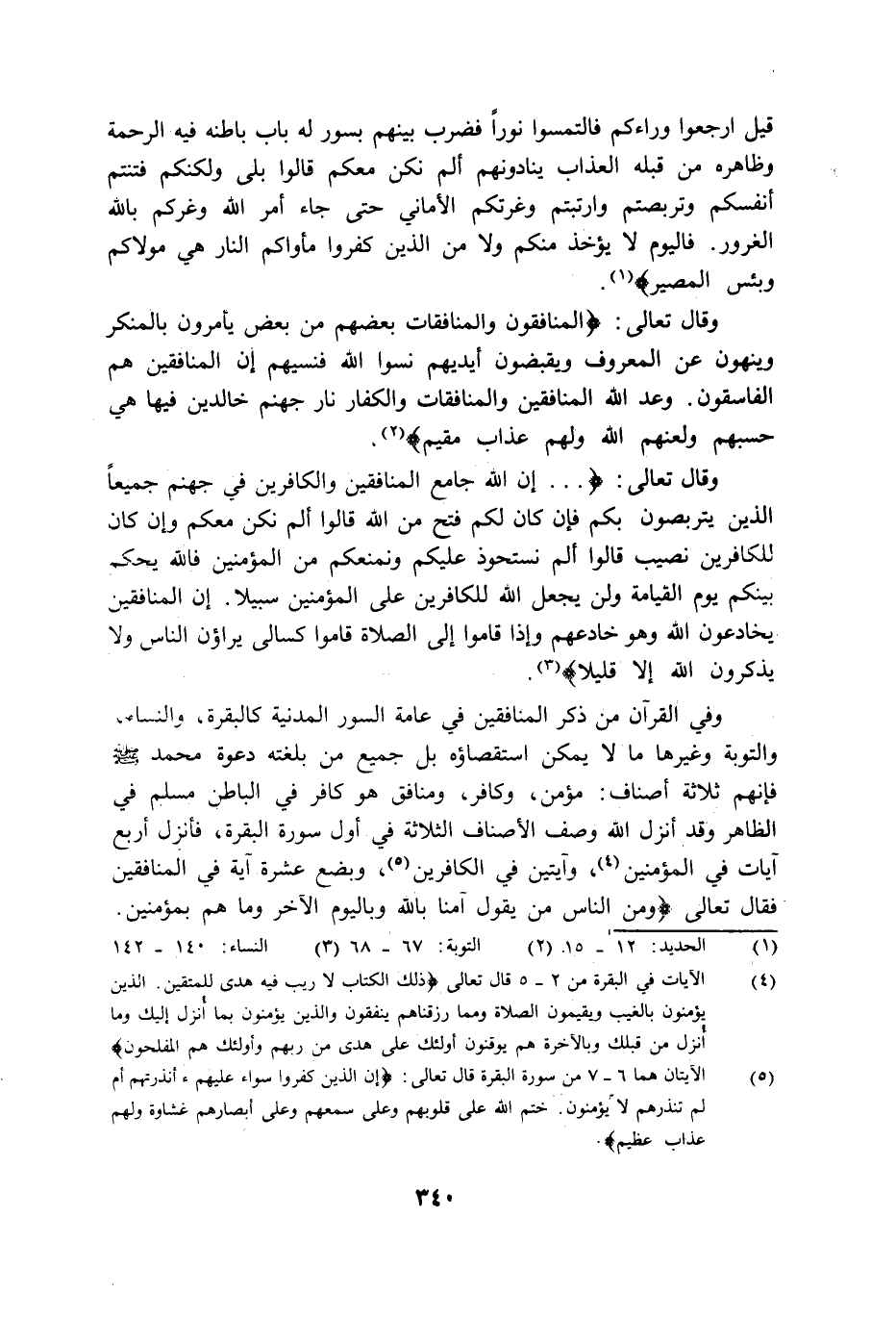 وفي القرآن من ذكر المنافقين في عامة السور المدنية كالبقرة والنساء والتوبة وغيرها ما لا يمكن استقصاؤه بل جميع من بلغته دعوة محمد صلى الله عليه وسلم فإنهم ثلاثة أصناف: مؤمن وكافر ومنافق هو كافر في الباطن مسلم في الظاهر وقد أنزل الله وصف الأصناف الثلاثة في أول سورة البقرة فأنزل أربع آيات في المؤمنين وآيتين في الكافرين وبضع عشرة آية في المنافقين فقال تعالى: {وَمِنَ النَّاسِ مَنْ يَقُولُ آمَنَّا بِاللَّهِ وَبِالْيَوْمِ الآخِرِ وَمَا هُمْ بِمُؤْمِنِينَ
