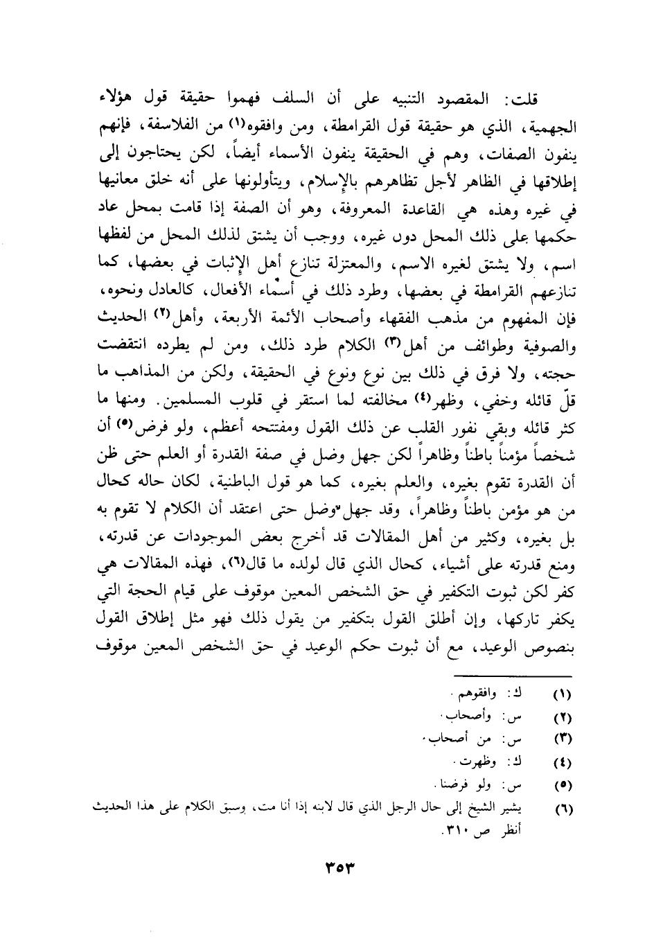 قلت: المقصود التنبيه على أن السلف فهموا حقيقة قول هؤلاء الجهمية الذي هو حقيقة قول القرامطة ومن وافقوه من الفلاسفة فإنهم ينفون الصفات وهم في الحقيقة ينفون الأسماء أيضا لكن يحتاجون إلى إطلاقها في الظاهر لأجل تظاهرهم بالإسلام ويتأولونها على أنه خلق معانيها في غيره وهذه هي القاعدة المعروفة وهو أن الصفة إذا قامت بمحل عاد حكمها على ذلك المحل دون غيره ووجب أن يشتق لذلك المحل من لفظها اسم ولا يشتق لغيره الاسم والمعتزلة تنازع أهل الإثبات في بعضها كما تنازعهم القرامطة في بعضها وطرد ذلك في أسماء الأفعال كالعادل ونحوه فإن المفهوم من مذهب الفقهاء وأصحاب الأئمة الأربعة وأهل الحديث والصوفية وطوائف من أهل الكلام طرد ذلك ومن لم يطرده انتقضت حجته ولا فرق في ذلك بين نوع ونوع في الحقيقة ولكن من المذاهب ما قل قائله وخفي وظهر مخالفته لما استقر في قلوب المسلمين ومنها ما كثر قائله وبقي نفور القلب عن ذلك القول ومفتتحه أعظم ولو فرض أن شخصا مؤمنا باطنا وظاهرا ولكن جهل وضل في صفة القدرة أو العلم حتى ظن أن القدرة تقوم بغيره والعلم بغيره كما هو قول الباطنية لكان حاله كحال من هو مؤمن باطنا وظاهرا وقد جهل وضل حتى اعتقد أن الكلام لا تقوم به بل بغيره وكثير من أهل المقالات قد أخرج بعض الموجودات عن قدرته ومنع قدرته عن أشياء كحال الذي قال لولده ما قال فهذه المقالات هي كفر لكن ثبوت التكفير في حق الشخص المعين موقوف على قيام الحجة التي يكفر تاركها وإن أطلق القول بتكفير من يقول ذلك فهو مثل إطلاق القول بنصوص الوعيد مع أن ثبوت حكم الوعيد في حق الشخص المعين موقوف