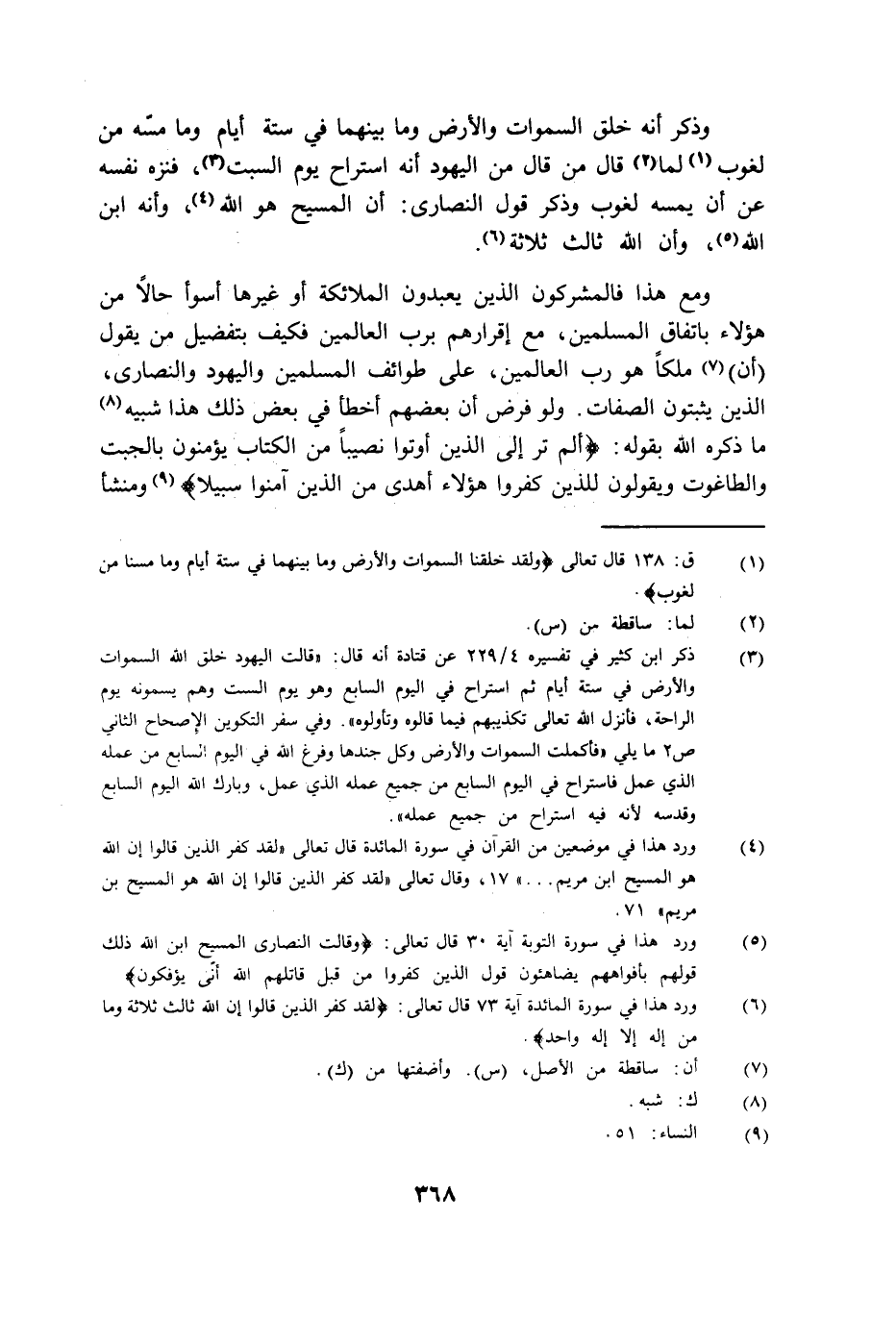 وذكر أنه خلق السماوات والأرض وما بينهما في ستة أيام وما مسه من لغوب لما قال من قال من اليهود أنه استراح يوم السبت فنزه نفسه عن أن يمسه لغوب وذكر قول النصارى أن المسيح هو الله وأنه ابن الله وأن الله ثالث ثلاثة.