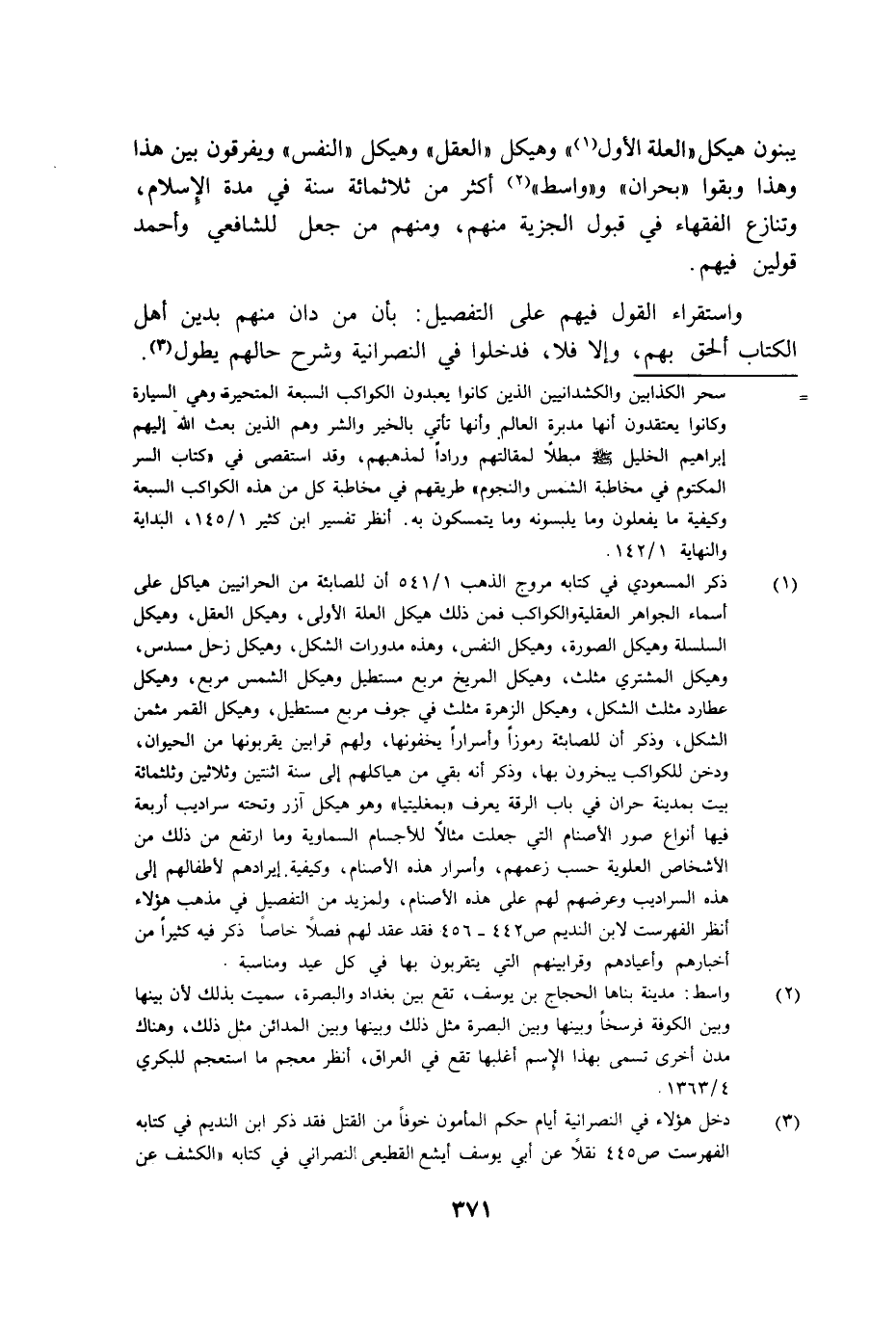 يبنون هيكل العلة الأول وهيكل العقل وهيكل النفس ويفرقون بين هذا وهذا وبقوا بحران وواسط أكثر من ثلاثمائة سنة في مدة الإسلام وتنازع الفقهاء في قبول الجزية منهم ومنهم من جعل للشافعي وأحمد قولين فيهم.