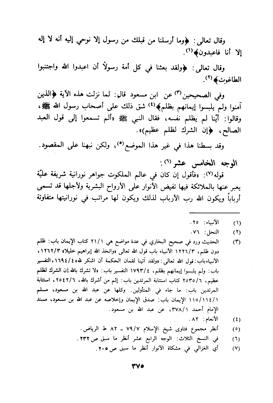 قوله: "فأقول إن كان في عالم الملكوت جواهر نورانية شريفة علية يعبر عنها بالملائكة فيها تفيض الأنوار على الأرواح البشرية ولأجلها قد تسمى أربابا ويكون الله رب الأرباب لذلك ويكون لها مراتب في نورانيتها متفاوتة