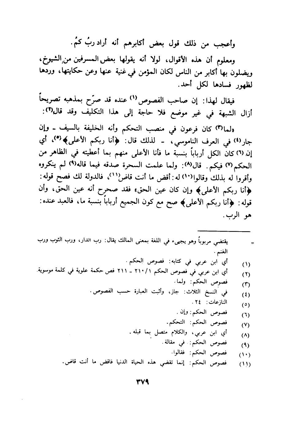 فيقال لهذا: إن صاحب الفصوص عنده قد صرح بمذهبه تصريحا أزال الشبهة في غير موضع فلا حاجة إلى هذا التكليف وقد قال: "لما كان فرعون في منصب التحكم وأنه الخليفة بالسيف وإن جار في العرف الناموسي لذلك قال: {أَنَا رَبُّكُمُ الأَعْلَى} أي إن كان الكل أربابا بنسبة ما فأنا الأعلى منهم بما أعطيته في الظاهر من الحكم فيكم قال: ولما علمت السحرة صدقه فيما قاله لم ينكروه وأقروا له بذلك وقالوا له اقض ما أنت قاض فالدولة لك فصح قوله: {أَنَا رَبُّكُمُ الأَعْلَى} وإن كان عين الحق فقد صرح أنه عين الحق وأن قوله: {أَنَا رَبُّكُمُ الأَعْلَى} صح مع كون الجميع أربابا بنسبة ما فالعبد عنده هو الرب.