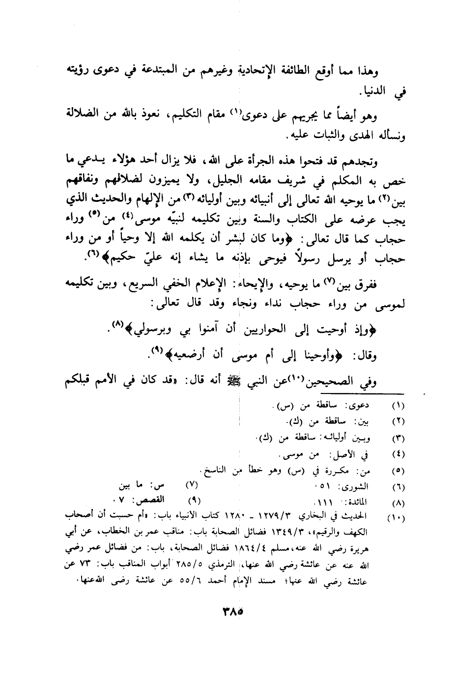 وتجدهم قد فتحوا هذه الجرأة على الله فلا يزال أحد هؤلاء يدعي ما خص به المكلم في شريف مقامه الجليل ولا يميزون لضلالهم ونفاقهم بين ما يوحيه الله تعالى إلى أنبيائه وبين أوليائه من الإلهام والحديث الذي يجب عرضه على الكتاب والسنة وبين تكليمه لنبيه موسى من وراء حجاب كما قال تعالى: {وَمَا كَانَ لِبَشَرٍ أَنْ يُكَلِّمَهُ اللَّهُ إِلاَّ وَحْياً أَوْ مِنْ وَرَاءِ حِجَابٍ أَوْ يُرْسِلَ رَسُولاً فَيُوحِيَ بِإِذْنِهِ مَا يَشَاءُ إِنَّهُ عَلِيٌّ حَكِيمٌ} .