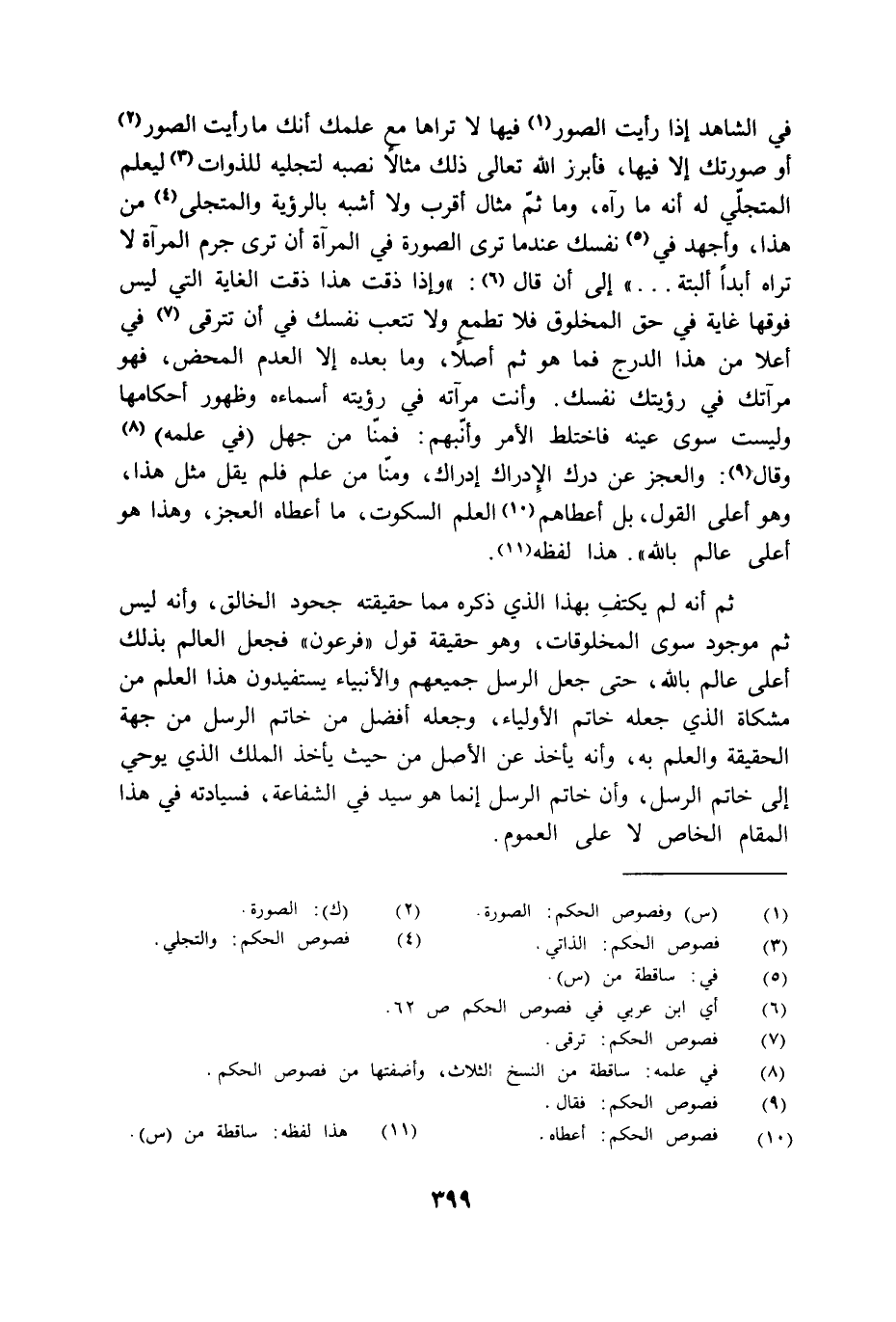 ثم أنه لم يكتف بهذا الذي ذكره مما حقيقته جحود الخالق وأنه ليس ثم موجود سوى المخلوقات وهو حقيقة قول فرعون فجعل العالم بذلك أعلى عالم بالله حتى جعل الرسل جميعهم والأنبياء يستفيدون هذا العلم من مشكاة الذي جعله خاتم الأولياء وجعله أفضل من خاتم الرسل من جهة الحقيقة والعلم به وأنه يأخذ عن الأصل من حيث يأخذ الملك الذي يوحي إلى خاتم الرسل وأن خاتم الرسل إنما هو سيد في الشفاعة فسيادته في هذا المقام الخاص لا على العموم.