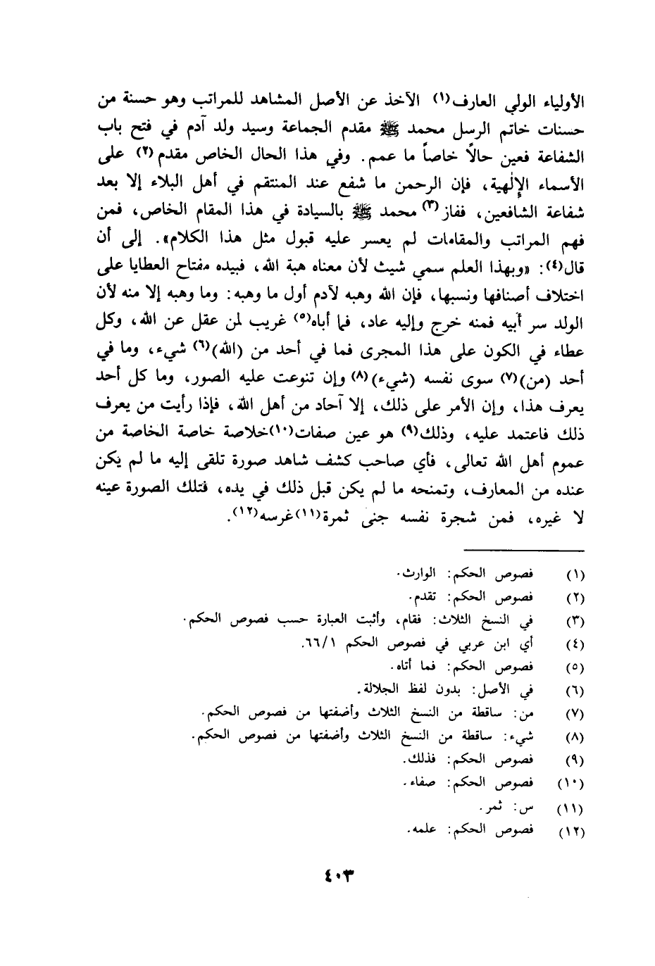 الأولياء الولي العارف الآخذ عن الأصل المشاهد للمراتب وهو حسنة من حسنات خاتم الرسل محمد صلى الله عليه وسلم مقدم الجماعة وسيد ولد آدم في فتح باب الشفاعة فعين حالا خاصا ما عمم وفي هذا الحال الخاص مقدم على الأسماء الإلهية فإن الرحمن ما شفع عند المنتقم في أهل البلاء إلا بعد شفاعة الشافعين ففاز محمد صلى الله عليه وسلم بالسيادة في هذا المقام الخاص فمن فهم المراتب والمقامات لم يعسر عليه قبول مثل هذا الكلام إلى أن قال: "وبهذا العلم سمي شيث لأنه معناه هبة الله فبيده مفتاح العطايا على اختلاف أصنافها ونسبها فإن الله وهبه لآدم أول ما وهبه وما وهبه إلا منه لأن الولد سر أبيه فمنه خرج وإليه عاد فما أباه غريب لمن عقل عن الله وكل عطاء في الكون على هذا المجرى فما في أحد من الله شيء وما في أحد من سوى نفسه شيء وإن تنوعت عليه الصور وما كل أحد يعرف هذا وإن الأمر على ذلك إلا آحاد من أهل الله فإذا رأيت من يعرف ذلك فاعتمد عليه وذلك هو عين صفات خلاصة خاصة الخاصة من عموم أهل الله تعالى فأي صاحب كشف شاهد صورة تلقى إليه ما لم يكن عنده من المعارف وتحنه ما لم يكن قبل ذلك في يده فتلك الصورة عينه لا غيره فمن شجرة نفسه جنى ثمرة غرسه".