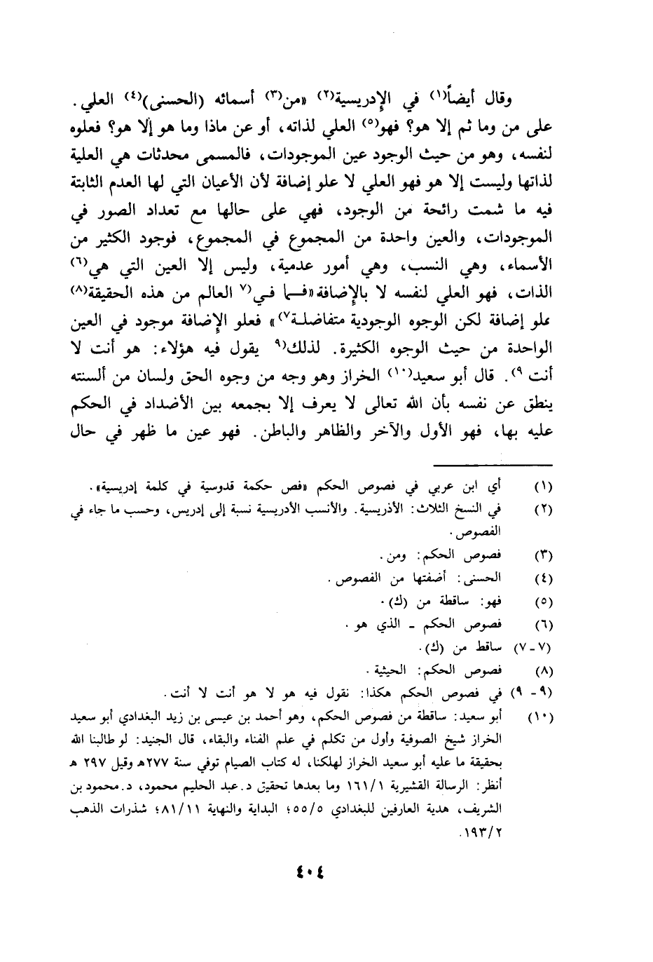 وقال أيضا في الإدريسية: "من أسمائه الحسنى العلي على من وما ثم إلا هو؟ فهو العلي لذاته أو عن ماذا وما هو إلا هو؟ فعلوه لنفسه وهو من حيث الوجود عين الموجوات فالمسمى محدثات هي العلية لذاتها وليست إلا هو فهو العلي لا علو إضافة لأن الأعيان التي لها العدم الثابتة فيه ما شمت رائحة من الوجود فهي على حالها مع تعداد الصور في الموجودات والعين واحدة من المجموع في المجموع فوجود الكثير من الأسماء وهي النسب وهي أمور عدمية وليس إلى العين التي هي الذات فهو العلي لنفسه لا بالإضافة فما في العالم من هذه الحقيقة علو إضافة لكن الوجوه الوجودية متفاضلة فعلو الإضافة موجود في العين الواحدة من حيث الوجوه الكثيرة لذلك يقول فيه هؤلاء هو أنت لا أنت قال أبو سعيد الخراز: "وهو وجه من وجوه الحق ولسان من ألسنته ينطق عن نفسه بأن الله تعالى لا يعرف إلا بجمعه بين الأضداد في الحكم عليه بها فهو الأول والآخر والظاهر والباطن فهو عين ما ظهر في حال