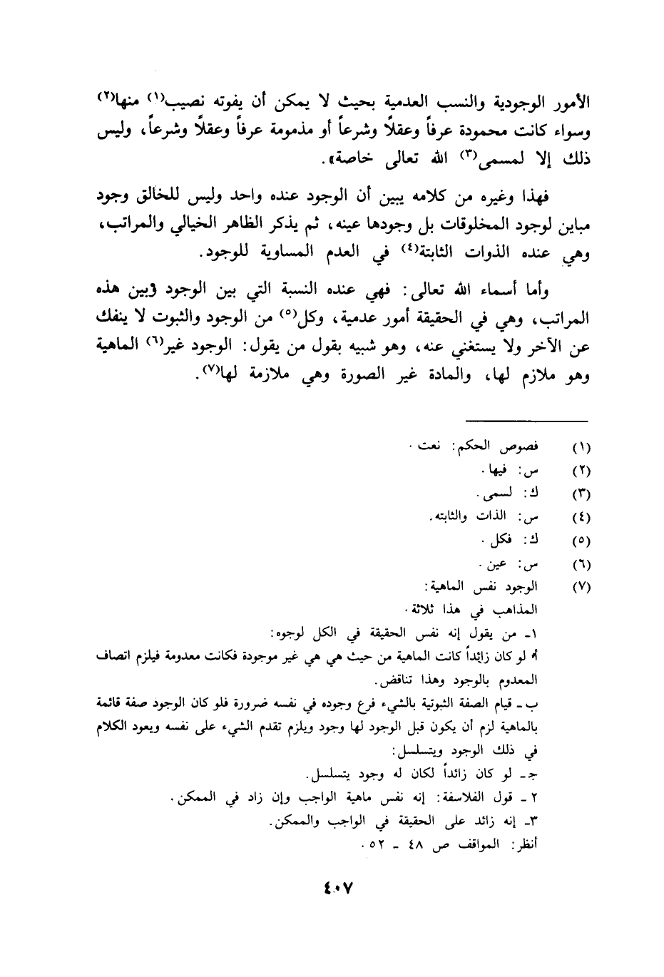 وأما أسماء الله تعالى: فهي عنده النسبة التي بين الوجود وبين هذه المراتب وهي في الحقيقة أمور عدمية وكل من الوجود والثبوت لا ينفك عن الآخر ولا يستغني عنه وهو شبيه بقول من يقول الوجود غير الماهية وهو ملازم لها والمادة غير الصورة وهي ملازمة لها.