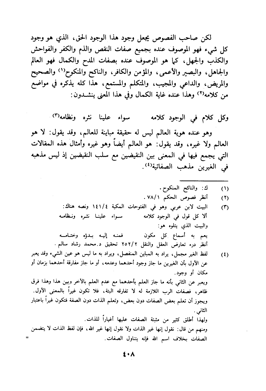 لكن صاحب الفصوص يجعل وجود هذا الوجود الحق الذي هو وجود كل شيء فهو الموصوف عنده بجميع صفات النقص والذم والكفر والفواحش والكذب والجهل كما هو الموصوف عنده بصفات المدح والكمال فهو العالم والجاهل والبصير والأعمى والمؤمن والكافر والناكح والمنكوح والصحيح والمريض والداعي والمجيب والمتكلم والمستمع هذا كله يذكره في مواضع من كلامه وهذا عنده غاية الكمال وفي هذا المعنى ينشدون: