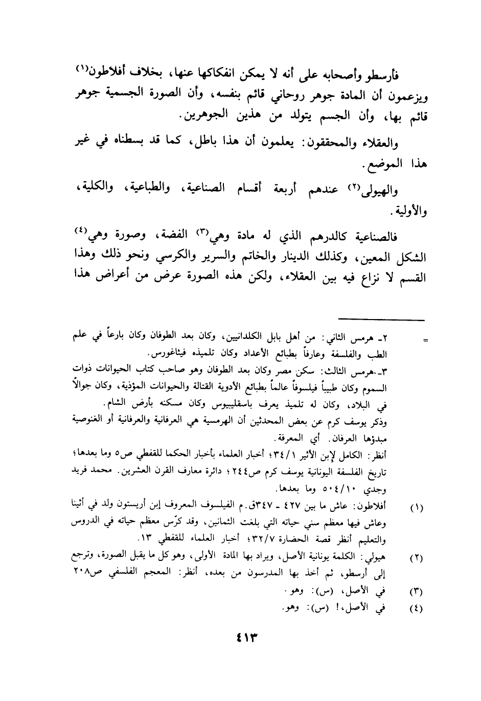 فأرسطو وأصحابه على أنه يمكن انفكاكها عنها بخلاف أفلاطون ويزعمون أن المادة جوهر روحاني قائم بنفسه وأن الصورة الجسمية جوهر قائم بها وأن الجسم يتولد من هذين الجوهرين.