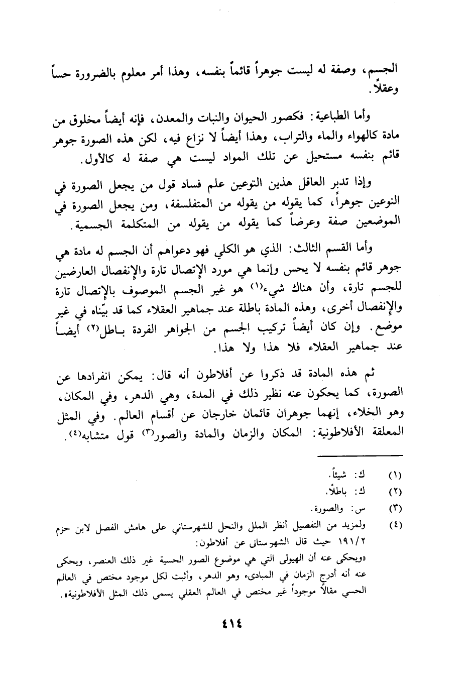 ثم هذه المادة قد ذكروا عن أفلاطون أنه قال يمكن انفرادها عن الصورة كما يحكون عنه نظير ذلك في المدة وهي الدهر وفي المكان وهو الخلاء إنهما جوهران قائمان خارجان عن أقسام العالم وفي المثل المعلقة الأفلاطونية المكان والزمان والمادة والصور قول متشابه.