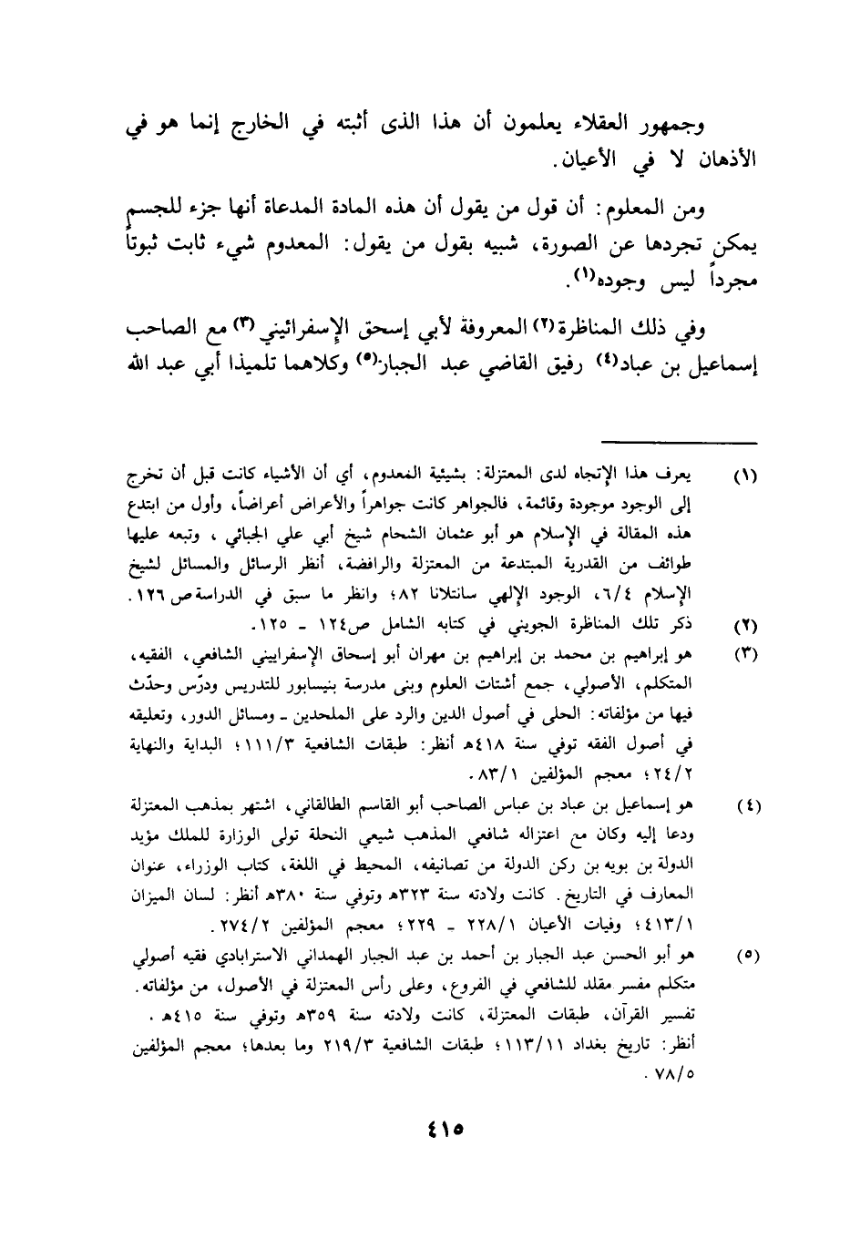 وفي ذلك المناظرة المعروفة لأبي إسحاق الإسفرائيني مع الصاحب إسماعيل بن عباد رفيق القاضي عبد الجبار وكلاهما تلميذا أبي عبد الله