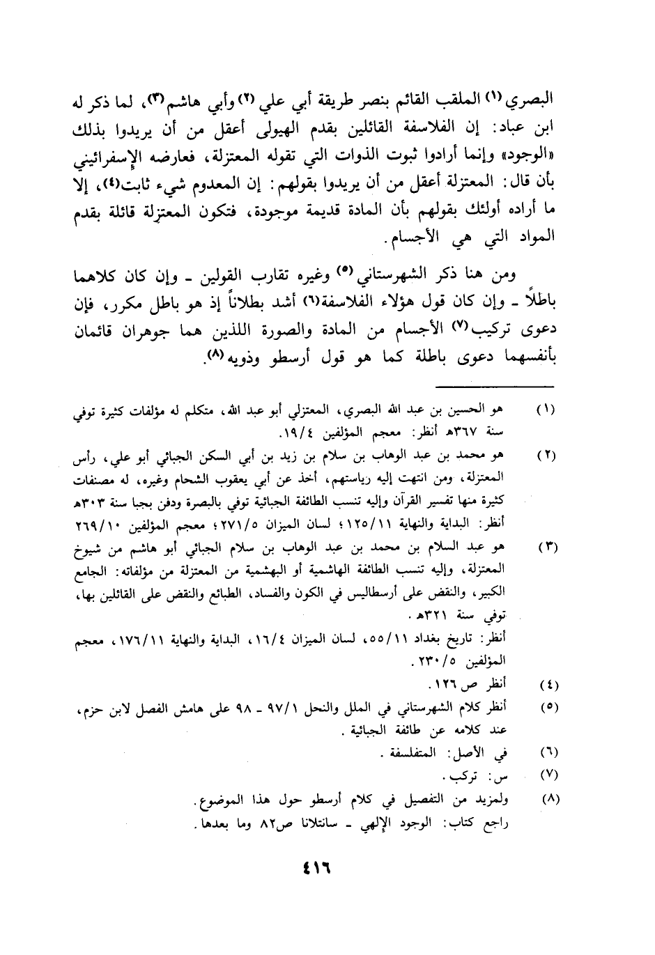 البصري الملقب القائم بنصر طريقة أبي علي وأبي هاشم لما ذكر له ابن عباد إن الفلاسفة القائلين بقدم الهيولي أعقل من أن يريدوا بذلك الوجود وإنما أرادوا ثبوت الذوات التي تقوله المعتزلة فعارضه الإسفرائيني بأن قال المعتزلة أعقل من أن يريدوا بقولهم إن المعدوم شيء ثابت إلا ما أراده أولئك بقولهم بأن المادة قديمة موجودة فتكون المعتزلة قائلة بقدم المواد التي هي الأجسام.