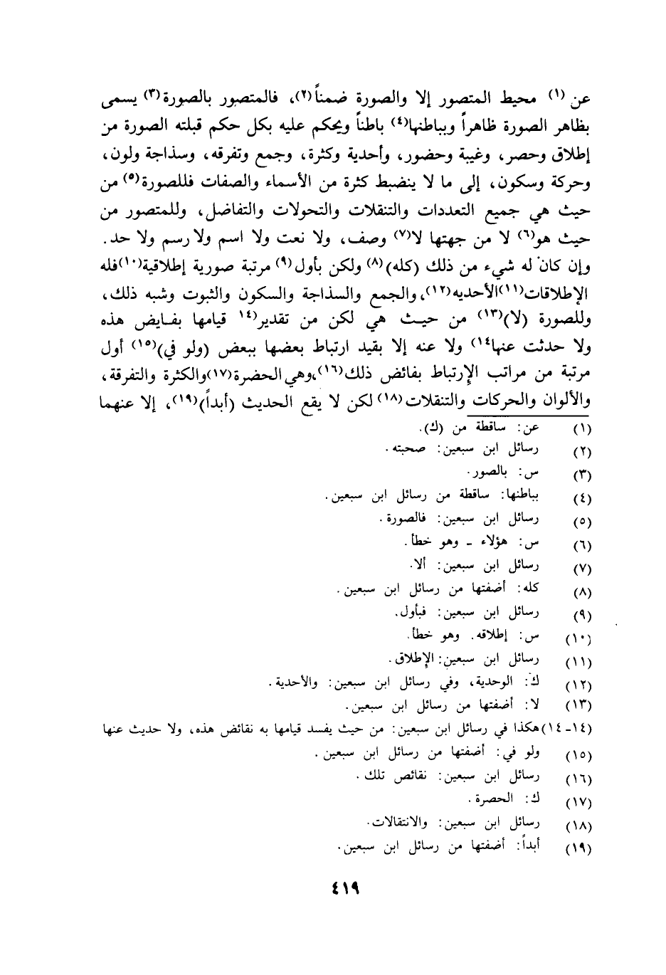 عن محيط المتصور إلا والصورة ضمنا فالمتصور بالصورة يسمى بظاهر الصورة ظاهرا وبباطنها باطنا ويحكم عليه حكم قبلته الصورة من إطلاق وحصر وغيبة وحضور وأحدية وكثرة وجمع وتفرقة وسذاجة ولون وحركة وسكون إلى ما لا ينضبط كثرة من الأسماء والصفات فللصورة من حيث هي جميع التعددات والتنقلات والتحولات والتفاضل وللمتصور من حيث هو لا من جهتها لا وصف ولا نعت ولا اسم ولا رسم ولا حد وإن كان له شيء من ذلك كله ولكن بأول مرتبة صورية إطلاقية فله الإطلاقات الأحدية والجمع والسذاجة والسكون والثبوت وشبه ذلك وللصورة لا من حيث هي لكن من تقدير قيامها بفايض هذه ولا حدثت عنها ولا عنه إلا بقيد ارتباط بعضها ببعض ولو في أول مرتبة من مراتب الارتباط بفائض ذلك وهي الحضرة والكثرة والتفرقة والألوان والحركات والتنقلات لكن لا يقع الحديث أبدا إلا عنهما