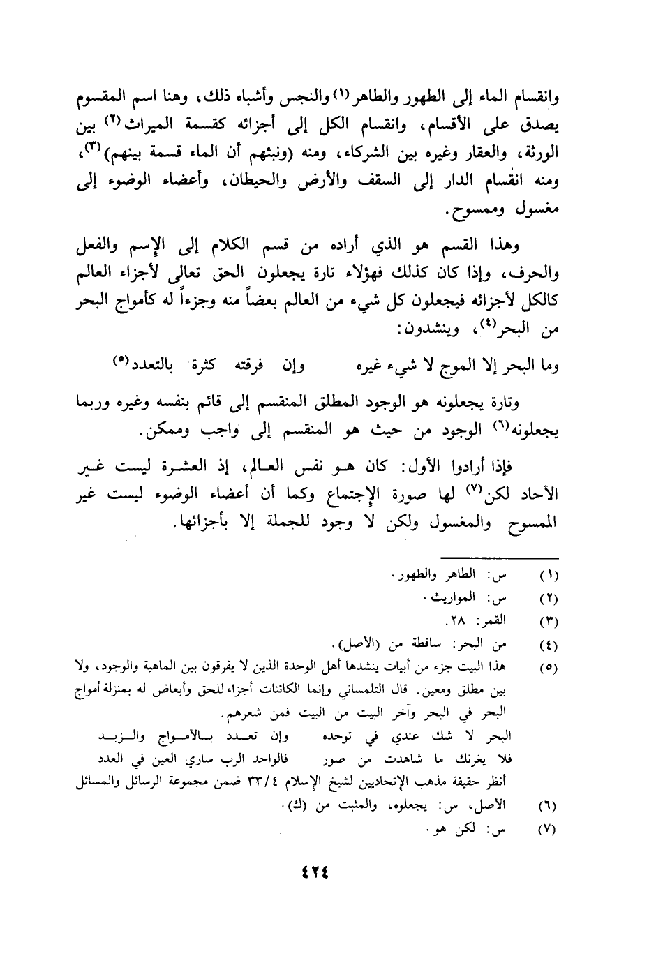 وهذا القسم هو الذي أراده من قسم الكلام إلى الاسم والفعل والحرف وإذا كان كذلك فهؤلاء تارة يجعلون الحق تعالى لأجزاء العالم كالكل لأجزائه فيجعلون كل شيء من العالم بعضا منه وجزءا له كأمواج البحر من البحر وينشدون: