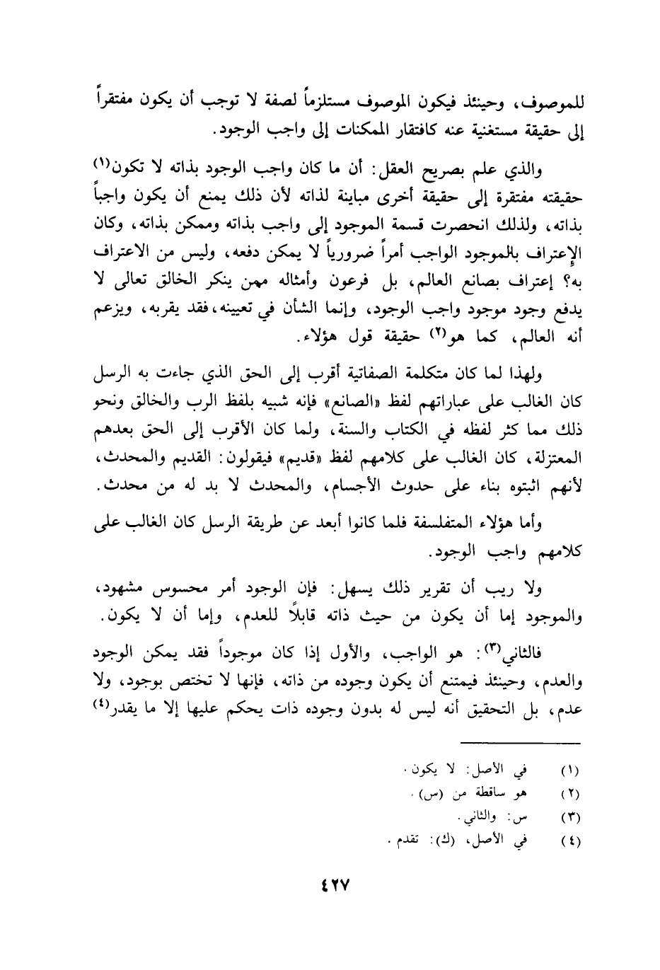 ولا ريب أن تقرير ذلك يسهل فإن الوجود أمر محسوس مشهود والموجود إما أن يكون من حيث ذاته قابلا للعدم وإما أن لا يكون.