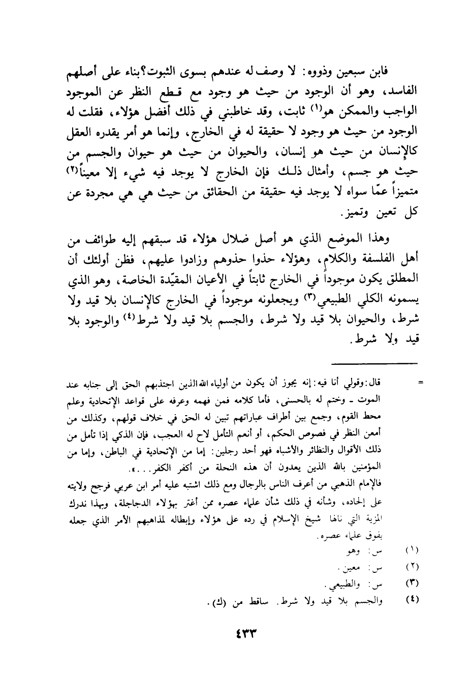 فابن سبعين وذووه لا وصف له عندهم بسوى الثبوت بناء على أصلهم الفاسد وهو أن الوجود من حيث هو وجود مع قطع النظر عن الموجود الواجب والممكن هو ثابت وقد خاطبني في ذلك أفضل هؤلاء فقلت له الوجود من حيث هو وجود لا حقيقة له في الخارج وإنما هو أمر يقدره العقل كالإنسان من حيث هو إنسان والحيوان من حيث هو حيوان والجسم من حيث هو جسم وأمثال ذلك فإن الخارج لا يوجد فيه شيء إلا معينا متميزا عما سواه لا يوجد فيه حقيقة من الحقائق من حيث هي هي مجردة عن كل تعين وتميز.