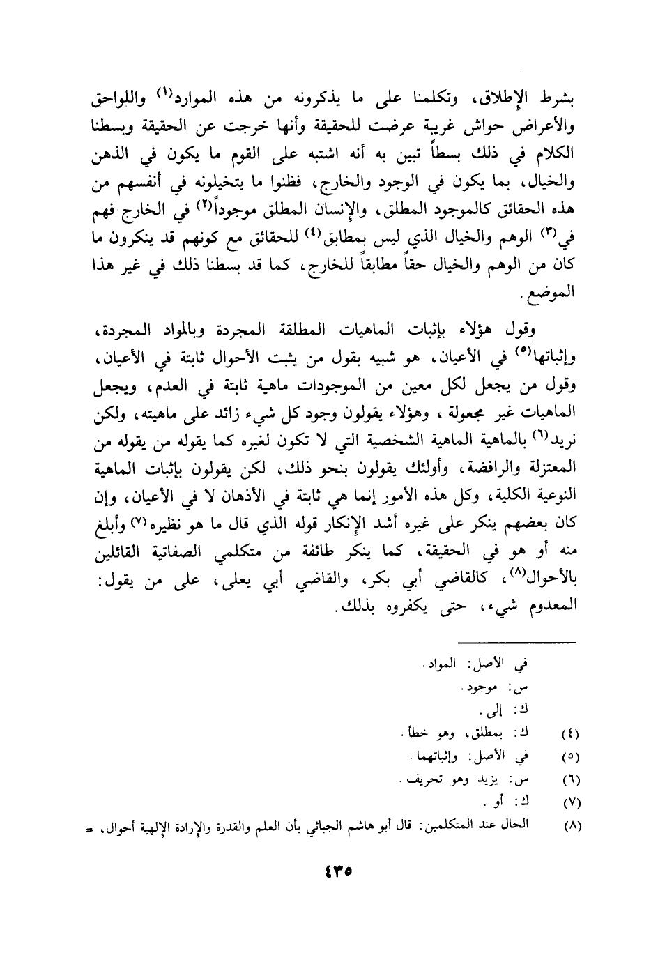 وقول هؤلاء بإثبات الماهيات المطلقة المجردة وبالمواد المجردة وإثباتها في الأعيان هو شبيه بقول من يثبت الأحوال ثابتة في الأعيان وقول من يجعل لكل معين من الموجودات ماهية ثابتة في العدم ويجعل الماهيات غير مجعولة وهؤلاء يقولون وجود كل شيء زائد على ماهيته ولكن نريد بالماهية الماهية الشخصية التي لا تكون لغيره كما يقوله من يقوله من المعتزلة والرافضة وأولئك يقولون بنحو ذلك لكن يقولون بإثبات الماهية النوعية الكلية وكل هذه الأمور إنما هي ثابتة في الأذهان لا في الأعيان وإن كان بعضهم ينكر على غيره أشد الإنكار قوله الذي قال ما هو نظيره وأبلغ منه أو هو في الحقيقة كما ينكر طائفة من متكلمي الصفاتية القائلين بالأحوال كالقاضي أبي بكر والقاضي أبي يعلى على من يقول المعدوم شيء حتى يكفروه بذلك.