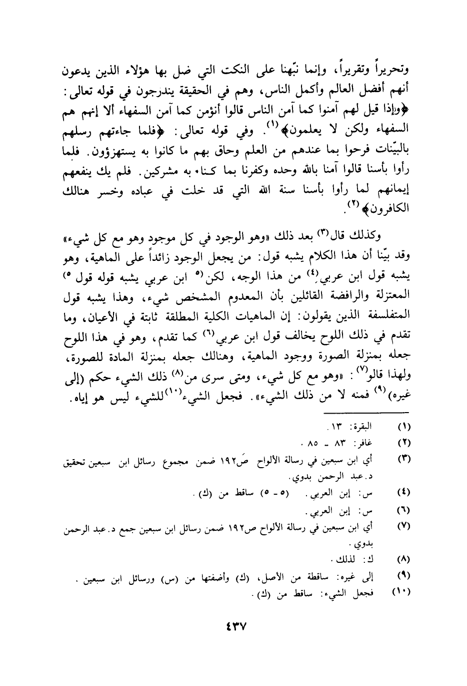 وكذلك قال بعد ذلك وهو الوجود في كل موجود وهو مع كل شيء وقد بينا أن هذا الكلام يشبه قول من يجعل الوجود زائدا على الماهية وهو يشبه قول ابن عربي من هذا الوجه لكن ابن عربي يشبه قول قول المعتزلة والرافضة القائلين بأن المعدوم المشخص شيء وهذا يشبه قول المتفلسفة الذين يقولون إن الماهيات الكلية المطلقة ثابتة في الأعيان وما تقدم في ذلك اللوح يخالف قول ابن عربي كما تقدم وهو في هذا اللوح جعله بمنزلة الصورة ووجود الماهية وهنالك جعله بمنزلة المادة للصورة ولهذا قالوا وهو مع كل شيء ومتى سرى من ذلك الشيء حكم إلى غيره فمنه لا من ذلك الشيء فجعل الشيء للشيء ليس هو إياه".