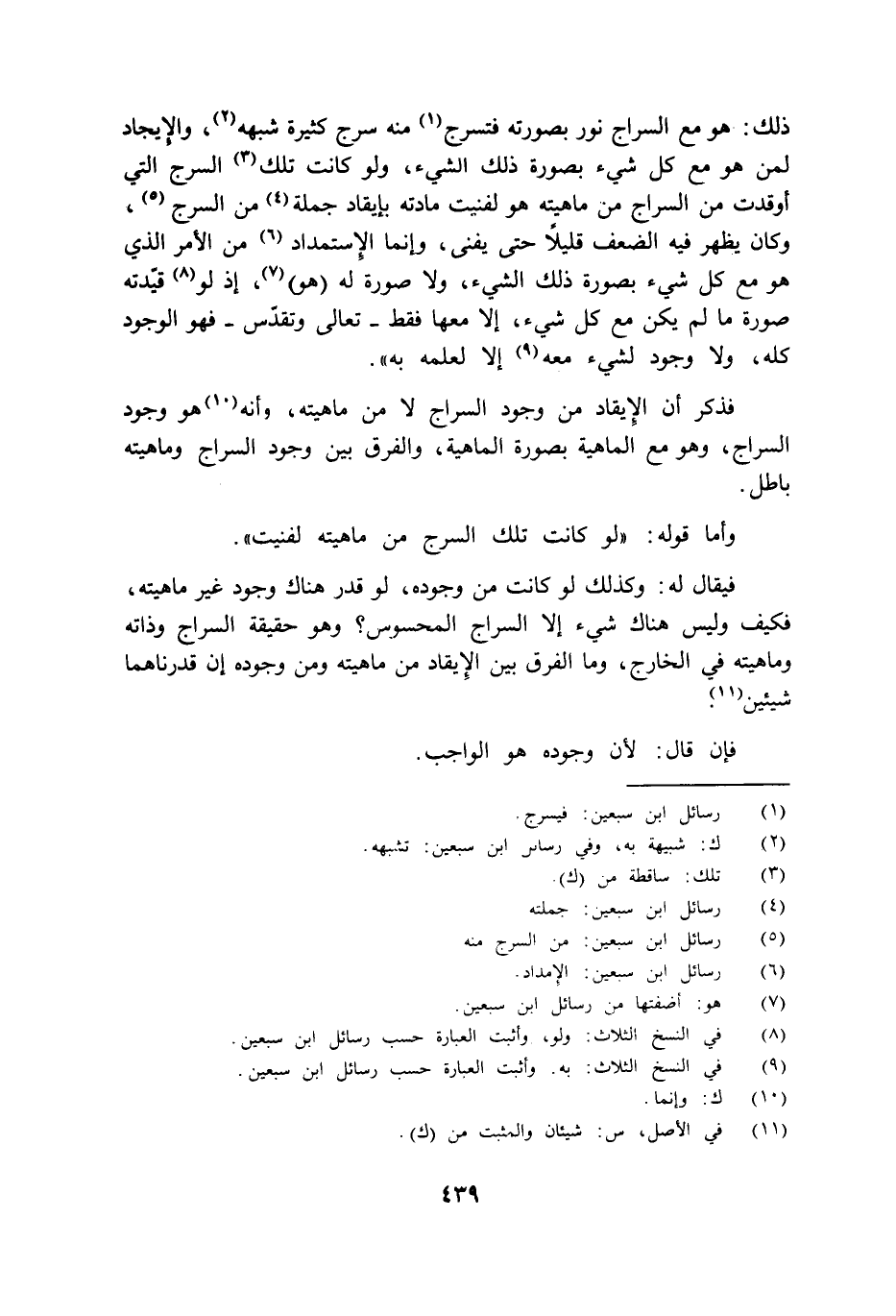 فذكر أن الإيقاد من وجود السراج لا من ماهيته وأنه هو وجود السراج وهو مع الماهية بصورة الماهية والفرق بين وجود السراج وماهيته باطل.