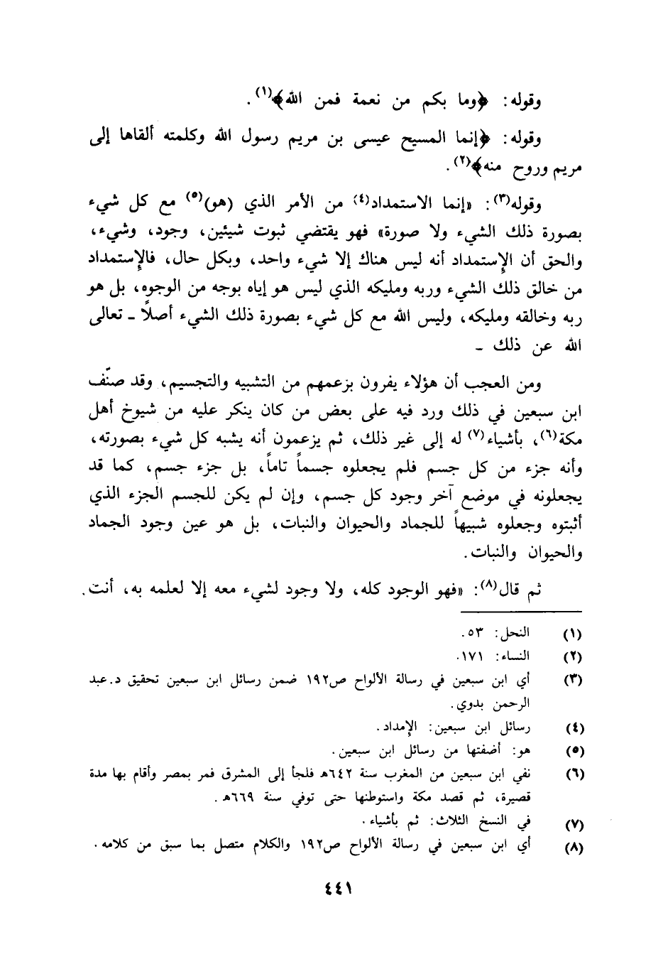 ومن العجب أن هؤلاء يفرون بزعمهم من التشبيه والتجسيم وقد صنف ابن سبعين في ذلك ورد فيه على بعض من كان ينكر عليه من شيوخ أهل مكة بأشياء له إلى غير ذلك ثم يزعمون أنه يشبه كل شيء بصورته وأنه جزء من كل جسم فلم يجعلوه جسما تاما بل جزء جسم كما قد يجعلونه في موضع آخر وجود كل جسم وإن لم يكن للجسم الجزء الذي أثبتوه وجعلوه شبيها للجماد والحيوان والنبات بل هو عين وجود الجماد والحيوان والنبات.
