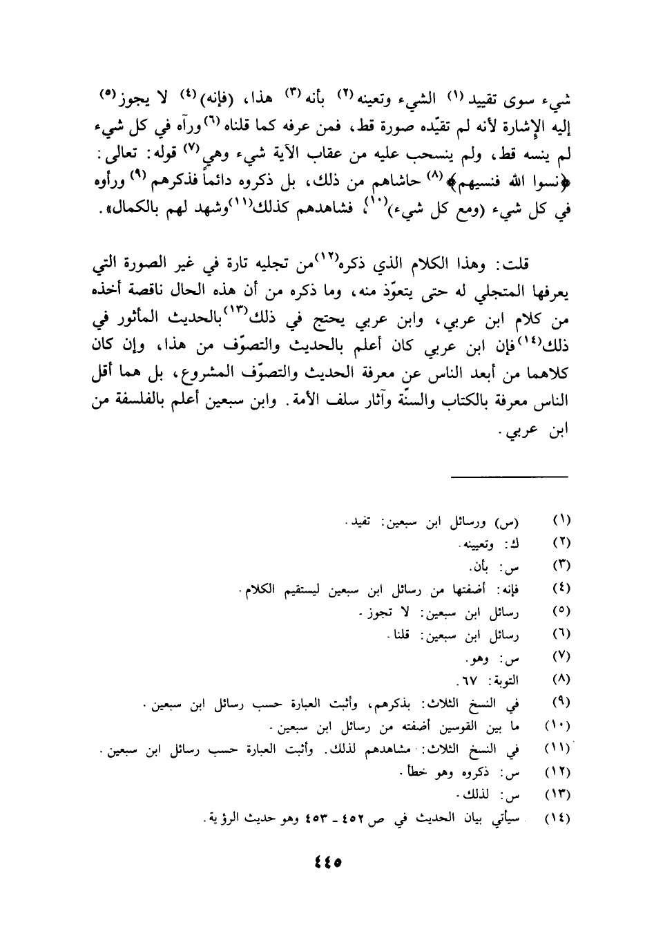 قلت: وهذا الكلام الذي ذكره من تجليه تارة في غير الصورة التي يعرفها المتجلي له حتى يتعوذ منه وما ذكره من أن هذه الحال ناقصة أخذه من كلام ابن عربي وابن عربي يحتج في ذلك بالحديث المأثور في ذلك فإن ابن عربي كان أعلم بالحديث والتصوف من هذا وإن كان كلاهما من أبعد الناس عن معرفة الحديث والتصوف المشروع بل هما أقل الناس معرفة بالكتاب والسنة وآثار سلف الأمة وابن سبعين أعلم بالفلسفة من ابن عربي.