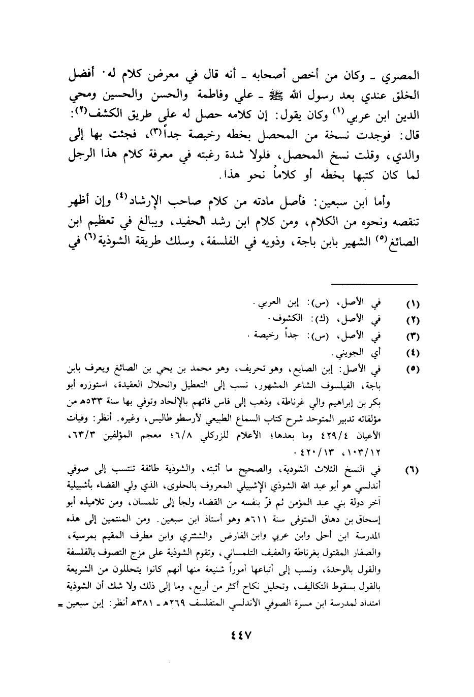 وأما ابن سبعين فأصل مادته من كلام صاحب الإرشاد وإن أظهر تنقصه ونحوه من الكلام ومن كلام ابن رشد الحفيد ويبالغ في تعظيم ابن الصائع الشهير بابن باجة وذويه في الفلسفة وسلك طريقة الشوذية في