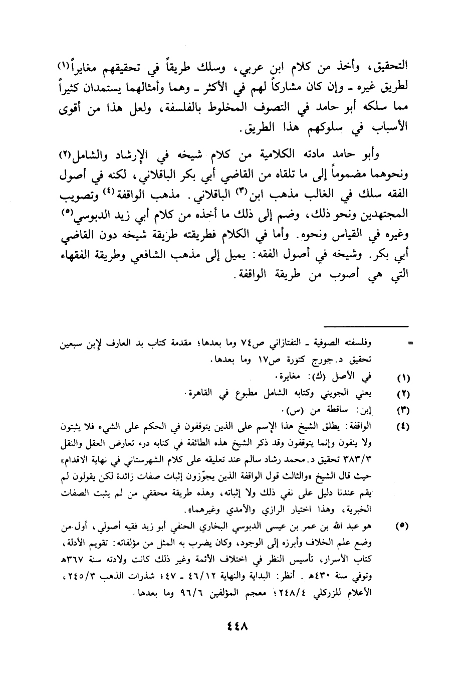 وأبو حامد مادته الكلامية من كلام شيخه في الإرشاد والشامل ونحوهما مضموما إلى ما تلقاه من القاضي أبي بكر الباقلاني لكنه في أصول الفقه سلك في الغالب مذهب ابن الباقلاني مذهب الواقفة وتصويب المجتهدين ونحو ذلك وضم إلى ذلك ما أخذه من كلام أبي زيد الدبوسي وغيره في القياس ونحوه وأما في الكلام فطريقته طريقة شيخه دون القاضي أبي بكر وشيخه في أصول الفقه يميل إلى مذهب الشافعي وطريقة الفقهاء التي هي أصوب من طريقة الواقفة.