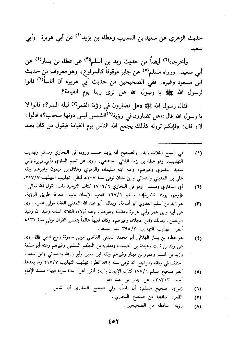 وأخرجاه أيضا من حديث زيد بن أسلم عن عطاء بن يسار عن أبي سعيد ورواه مسلم عن جابر موقوفا كالمرفوع وهو معروف من حديث ابن مسعود وغيره ففي الصحيحين من حديث أبي هريرة أن أناسا قالوا لرسول الله صلى الله عليه وسلم: يا رسول الله هل نرى ربنا يوم القيامة؟ فقال رسول الله صلى الله عليه وسلم: "هل تضارون في رؤية القمر ليلة البدر؟ قالوا: لا يا رسول الله قال: هل تضارون في رؤية الشمس ليس دونها سحاب؟ قالوا: لا قال: فإنكم ترونه كذلك يجمع الله الناس يوم القيامة فيقول: من كان يعبد