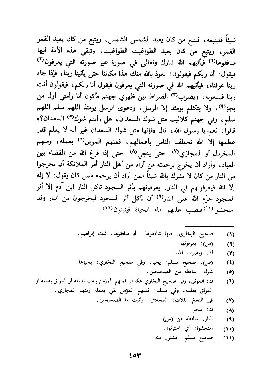 شيئا فليتبعه فيتبع من كان يعبد الشمس الشمس ويتبع من كان يعبد القمر القمر ويتبع من كان يعبد الطواغيت الطواغيت وتبقى هذه الأمة فيها منافقوها فيأتيهم الله تبارك وتعالى في صورة غير صورته التي يعرفون فيقول: أنا ربكم فيقولون: نعوذ بالله منك هذا مكاننا حتى يأتينا ربنا فإذا جاء ربنا عرفناه فيأتيهم الله في صورته التي يعرفون فيقول: أنا ربكم فيقولون: أنت ربنا فيتبعونه ويضرب الصراط بين ظهري جهنم فأكون أنا وأمتي أول من يجز ولا يتكلم يومئذ إلا الرسل ودعوى الرسل يومئذ: اللهم سلم اللهم سلم وفي جهنم كلاليب مثل شوك السعدان هل رأيتم شوك السعدان؟ قالوا: نعم يا رسول الله قال: فإنها مثل شوك السعدان غير أنه لا يعلم قدر عظمها إلا الله تخطف الناس بأعمالهم فمنهم الموبق بعمله ومنهم المخردل أو المجازي حتى ينجي حتى إذا فرغ الله من القضاء بين العباد وأراد أن يخرج برحمته من أراد من أهل النار أمر الملائكة أن يخرجوا من النار من كان لا يشرك بالله شيئا ممن أراد أن يرحمه ممن كان يقول: لا إله إلا الله فيعرفونهم في النار يعرفونهم بأثر السجود تأكل النار ابن آدم إلا اثر السجود حرم الله على النار أن تأكل أثر السجود فيخرجون من النار وقد امتحشوا فيصب عليهم ماء الحياة فينبتون".