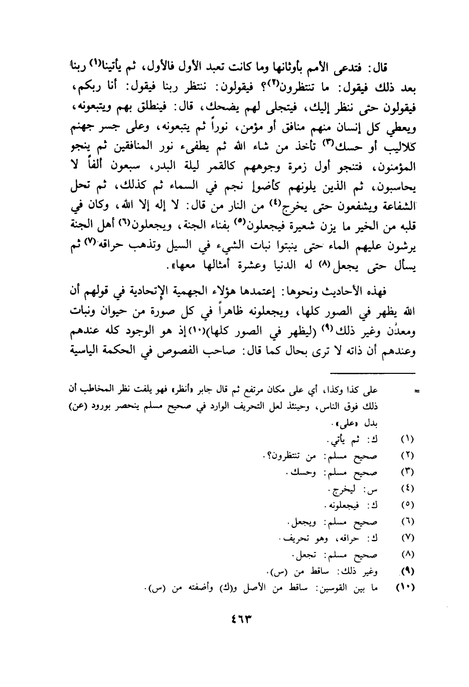فهذه الأحاديث ونحوها اعتمدها هؤلاء الجهمية الإتحادية في قولهم أن الله يظهر في الصور كلها ويجعلونه ظاهرا في كل صورة من حيوان ونبات ومعدن وغير ذلك ليظهر في الصور كلها إذ هو الوجود كله عندهم وعندهم أن ذاته لا ترى بحال كما قال صاحب الفصوص في الحكمة الياسية