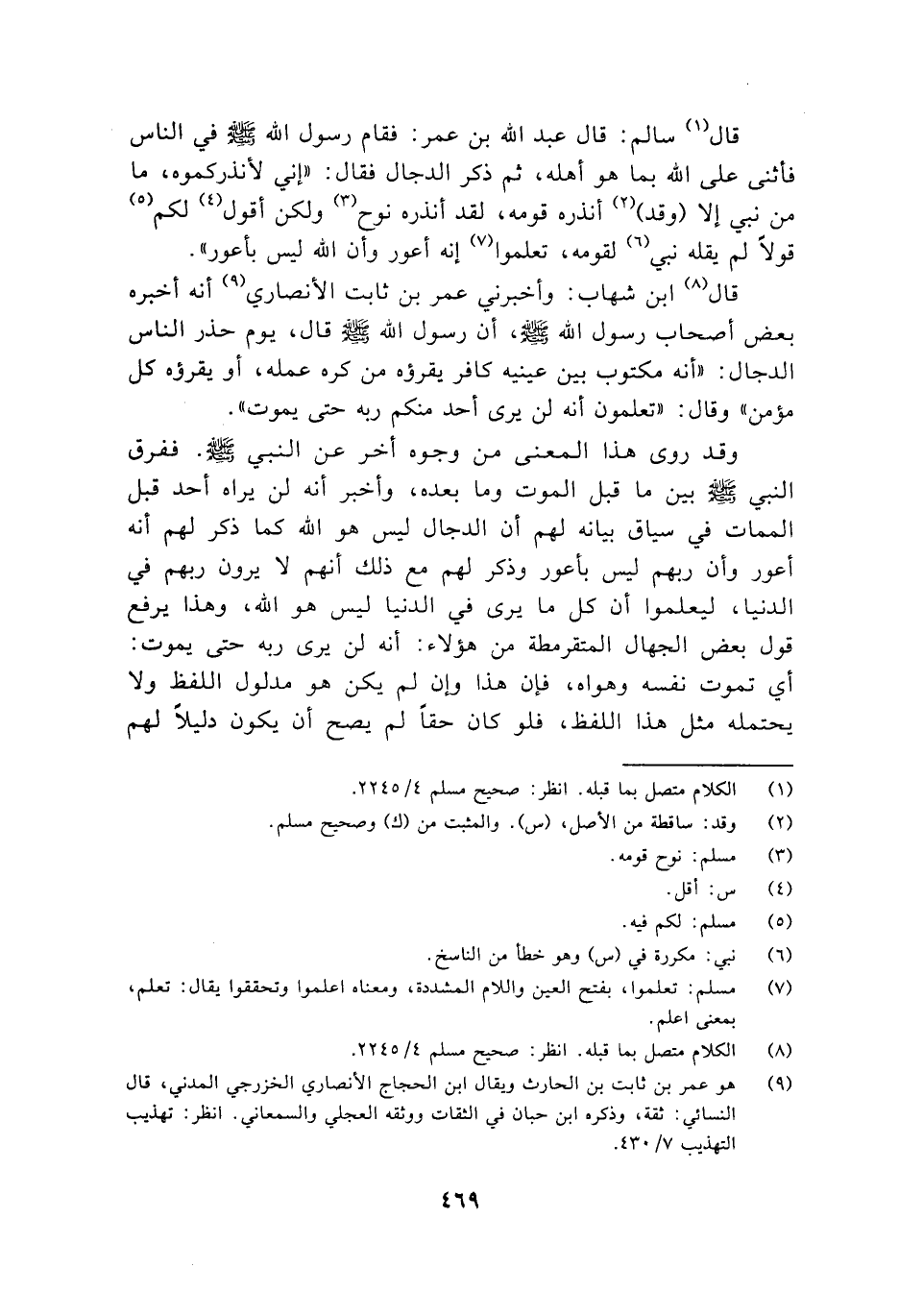 قال ابن شهاب: وأخبرني عمر بن ثابت الأنصاري أنه أخبر بعض أصحاب رسول الله صلى الله عليه وسلم أن رسول الله صلى الله عليه وسلم قال يوم حذر الناس الدجال "أنه مكتوب بين عينيه كافر يقرؤه من كره عمله أو يقرؤه كل مؤمن" وقال: "تعلمون أنه لن يرى أحد منكم ربه حتى يموت".