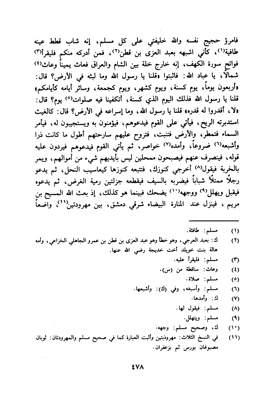 فامرؤ حجيج نفسه والله خليفتي على كل مسلم إنه شاب قطط عينه طافية كأني أشبهه بعبد العزى بن قطن فمن أدركه منكم فليقرأ فواتح سورة الكهف إنه خارج خلة بين الشام والعراق فعاث يمينا وعاث شمالا يا عباد الله فاثبتوا" قلنا: يا رسول الله وما لبثه في الأرض؟ قال: "أربعون يوما يوم كسنة ويوم كشهر ويوم كجمعة وسائر أيامه كأيامكم" قلنا: يا رسول الله فذلك اليوم الذي كسنة أتكفينا فيه صلوات يوم؟ قال: "لا أقدروا له قدره" قلنا: يا رسول الله وما إسراعه في الأرض؟ قال: "كالغيث استدبرته الريح فيأتي على القوم فيدعوهم فيؤمنون به ويستجيبون له فيأمر السماء فتمطر والأرض فتنبت فتروح عليهم سارحتهم أطول ما كانت ذرا وأشبعه ضروعا وأمده خواصر ثم يأتي القوم فيدعوهم فيردون عليه قوله فينصرف عنهم فيصبحون ممحلين ليس بأيديهم شيء من أموالهم ويمر بالخربة فيقول: أخرجي كنوزك فتتبعه كنوزها كيعاسيب النحل ثم يدعو رجلا ممتلأ شبابا فيضربه بالسيف فيقطعه جزلتين رمية الغرض ثم يدعوه فيقبل ويهلل ووجهه يضحك فبينما هو كذلك إذ بعث الله المسيح بن مريم فينزل عند المنارة البيضاء شرقي دمشق بين مهرودتين واضعا