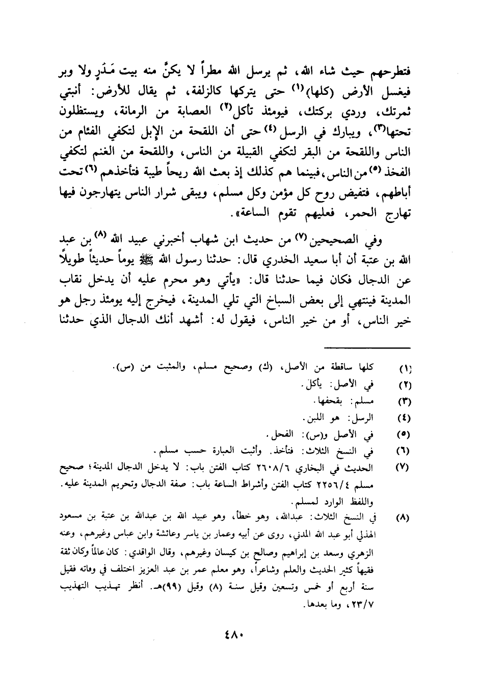 وفي الصحيحين من حديث ابن شهاب أخبرني عبيد الله بن عبد الله بن عتبة أن أبا سعيد الخدري قال: حدثنا رسول الله صلى الله عليه وسلم يوما حديثا طويلا عن الدجال فكان فيما حدثنا قال: "يأتي وهو محرم عليه أن يدخل نقاب المدينة فينتهي إلى بعض السباخ التي تلي المدينة فيخرج إليه يومئذ رجل هو خير الناس أو من خير الناس فيقول له أشهد أنك الدجال الذي حدثنا