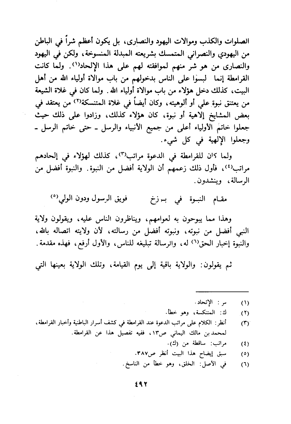 ولما كان للقرامطة في الدعوة مراتب كذلك لهؤلاء في إلحادهم مراتب فأول ذلك زعمهم أن الولاية أفضل من النبوة والنبوة أفضل من الرسالة وينشدون: