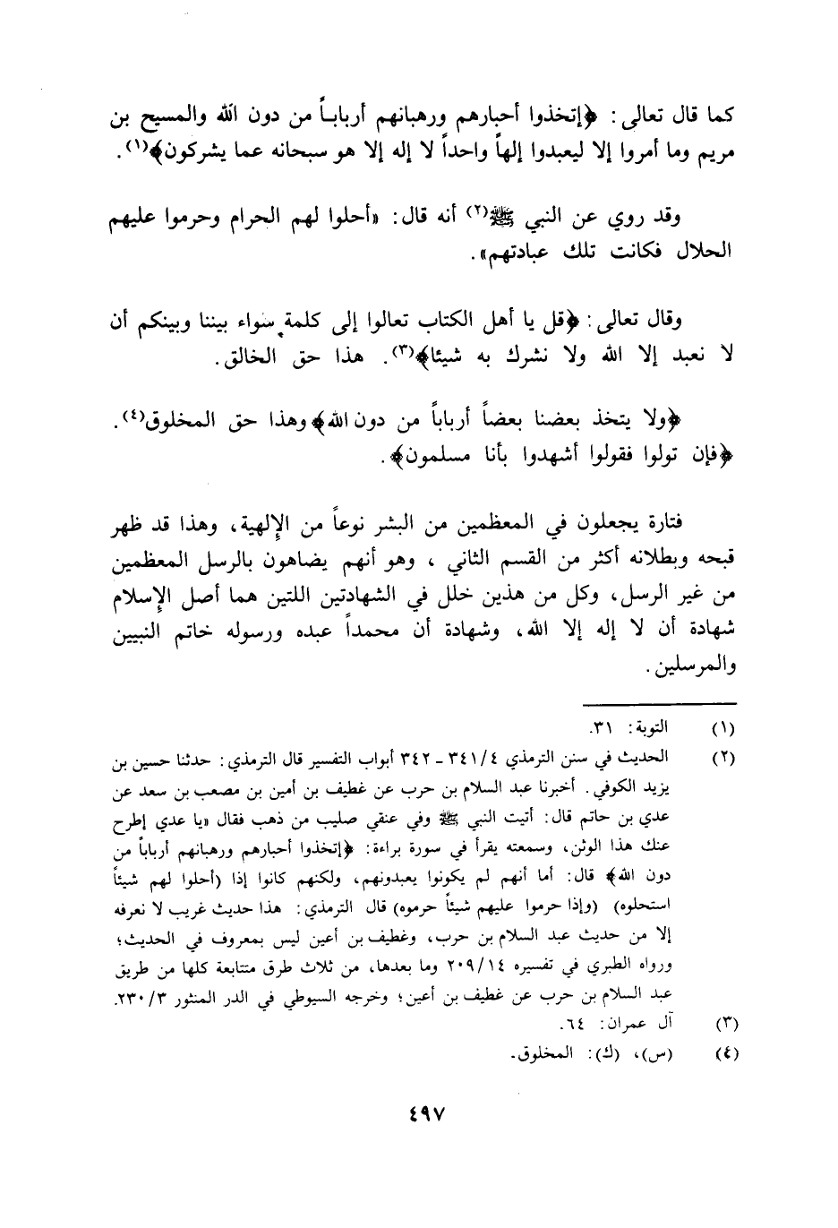 وقال تعالى: {قُلْ يَا أَهْلَ الْكِتَابِ تَعَالَوْا إِلَى كَلِمَةٍ سَوَاءٍ بَيْنَنَا وَبَيْنَكُمْ أَلاَّ نَعْبُدَ إِلاَّ اللَّهَ وَلا نُشْرِكَ بِهِ شَيْئاً} هذا حق الخالق {وَلا يَتَّخِذَ بَعْضُنَا بَعْضاً أَرْبَاباً مِنْ دُونِ اللَّهِ} وهذا حق المخلوق {فَإِنْ تَوَلَّوْا فَقُولُوا اشْهَدُوا بِأَنَّا مُسْلِمُونَ} .