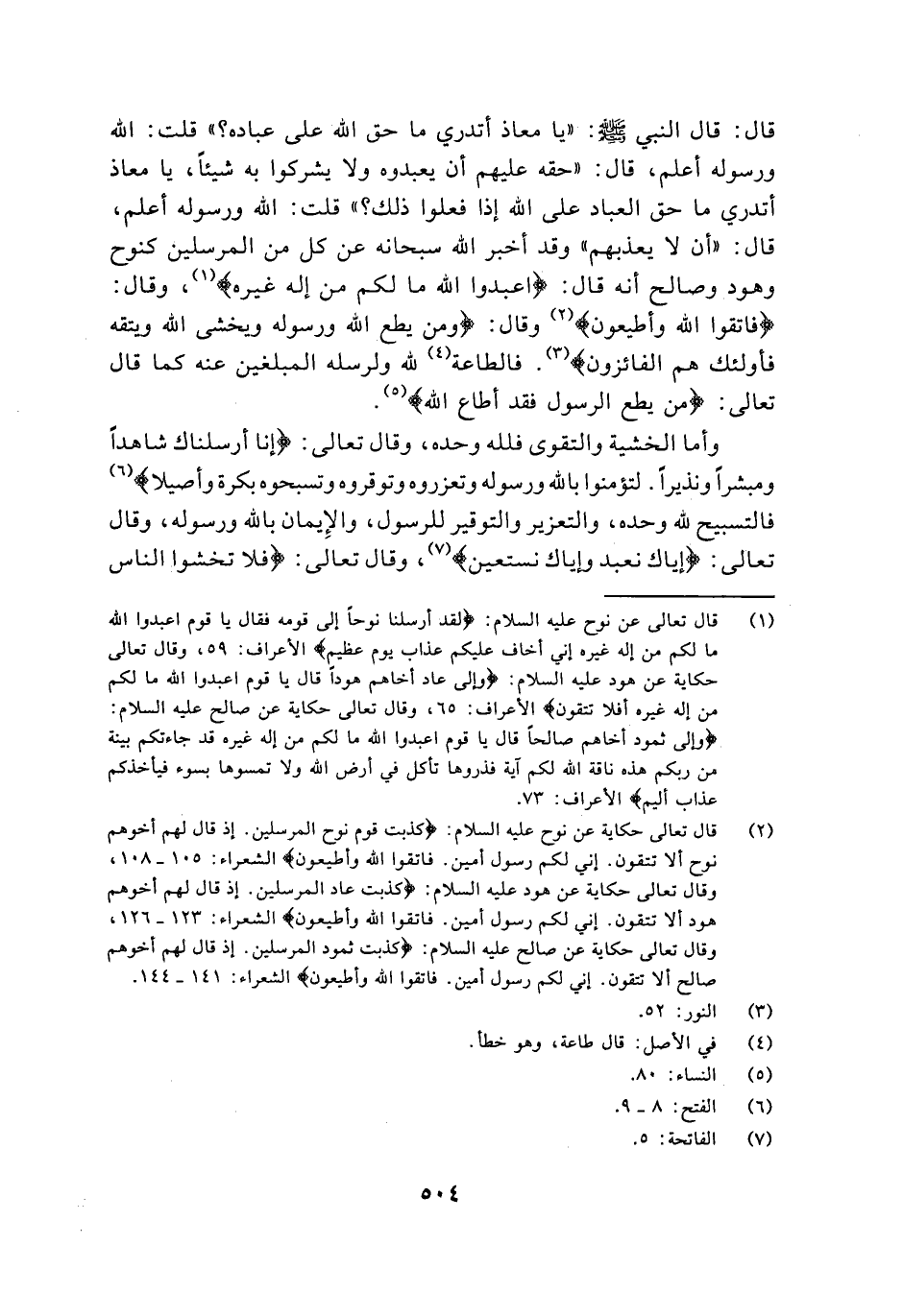 قال النبي صلى الله عليه وسلم: "يا معاذ أتدري ما حق الله على عباده؟ " قلت: الله ورسوله أعلم قال: "حقه عليهم أن يعبدوه ولا يشركوا به شيئا يا معاذ أتدري ما حق العباد على الله إذا فعلوا ذلك؟ " قلت: الله ورسوله أعلم قال: "أن لا يعذبهم". وقد أخبر الله سبحانه عن كل من المرسلين كنوح وهود وصالح أنه قال: {اعْبُدُوا اللَّهَ مَا لَكُمْ مِنْ إِلَهٍ غَيْرُهُ} وقال: {فَاتَّقُوا اللَّهَ وَأَطِيعُونِ} وقال: {وَمَنْ يُطِعِ اللَّهَ وَرَسُولَهُ وَيَخْشَ اللَّهَ وَيَتَّقْهِ فَأُولَئِكَ هُمُ الْفَائِزُونَ} فالطاعة لله ولرسله المبلغين عنه كما قال تعالى {مَنْ يُطِعِ الرَّسُولَ فَقَدْ أَطَاعَ اللَّهَ} .