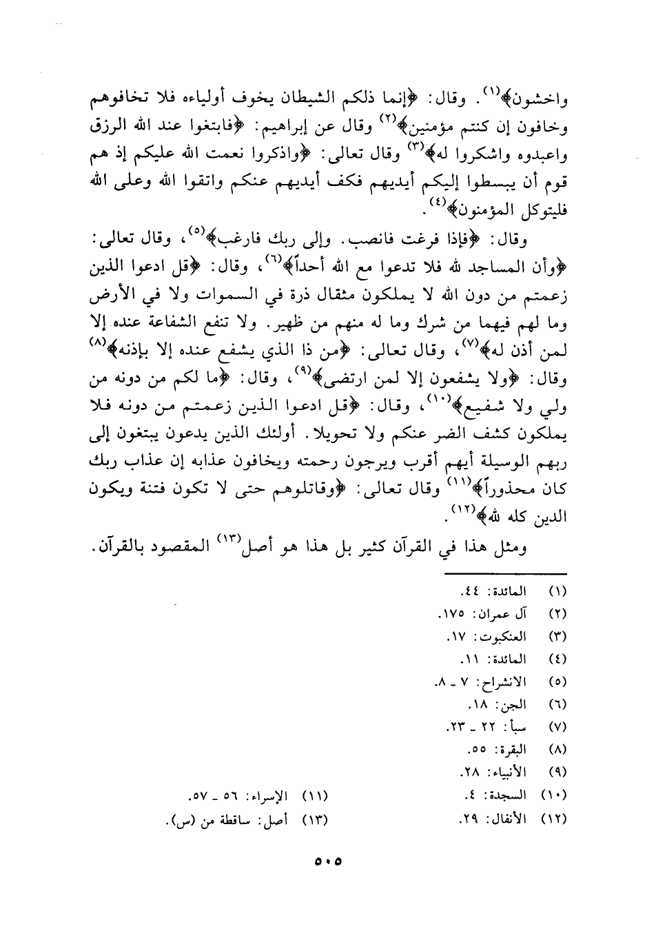 وقال: {فَإِذَا فَرَغْتَ فَانْصَبْ وَإِلَى رَبِّكَ فَارْغَبْ} وقال تعالى {وَأَنَّ الْمَسَاجِدَ لِلَّهِ فَلا تَدْعُو مَعَ اللَّهِ أَحَداً} وقال: {قُلِ ادْعُوا الَّذِينَ زَعَمْتُمْ مِنْ دُونِ اللَّهِ لا يَمْلِكُونَ مِثْقَالَ ذَرَّةٍ فِي السَّمَاوَاتِ وَلا فِي الأَرْضِ وَمَا لَهُمْ فِيهِمَا مِنْ شِرْكٍ وَمَا لَهُ مِنْهُمْ مِنْ ظَهِيرٍ وَلا تَنْفَعُ الشَّفَاعَةُ عِنْدَهُ إِلاَّ لِمَنْ أَذِنَ لَهُ} وقال تعالى: {مَنْ ذَا الَّذِي يَشْفَعُ عِنْدَهُ إِلاَّ بِإِذْنِهِ} وقال: {وَلا يَشْفَعُونَ إِلاَّ لِمَنِ ارْتَضَى} وقال: {مَا لَكُمْ مِنْ دُونِهِ مِنْ وَلِيٍّ وَلا شَفِيعٍ} وقال: {قُلِ ادْعُوا الَّذِينَ زَعَمْتُمْ مِنْ دُونِهِ فَلا يَمْلِكُونَ كَشْفَ الضُّرِّ عَنْكُمْ وَلا تَحْوِيلاً أُولَئِكَ الَّذِينَ يَدْعُونَ يَبْتَغُونَ إِلَى رَبِّهِمُ الْوَسِيلَةَ أَيُّهُمْ أَقْرَبُ وَيَرْجُونَ رَحْمَتَهُ وَيَخَافُونَ عَذَابَهُ إِنَّ عَذَابَ رَبِّكَ كَانَ مَحْذُوراً} وقال تعالى: {وَقَاتِلُوهُمْ حَتَّى لا تَكُونَ فِتْنَةٌ وَيَكُونَ الدِّينُ كُلُّهُ لِلَّهِ} .